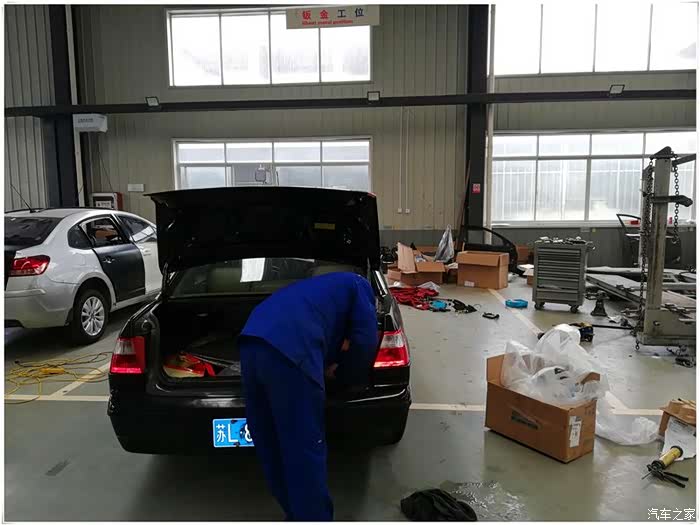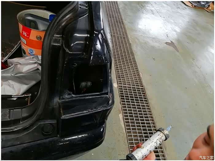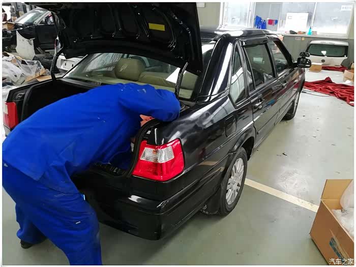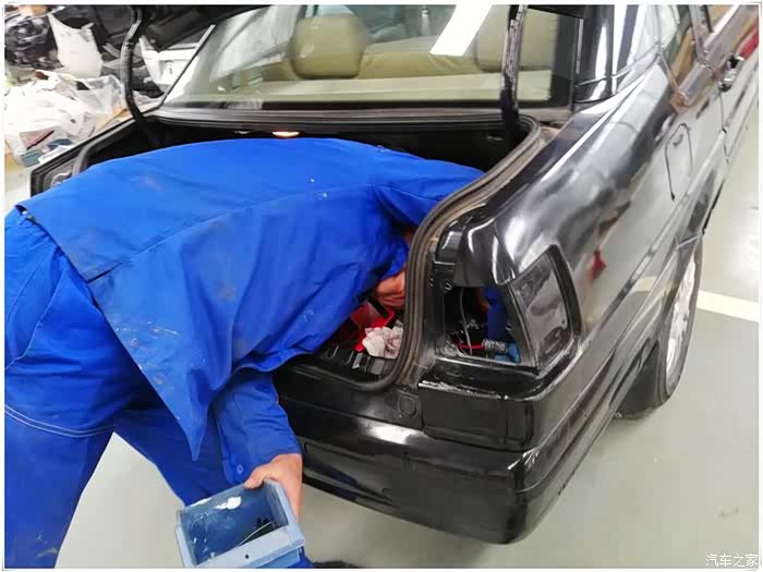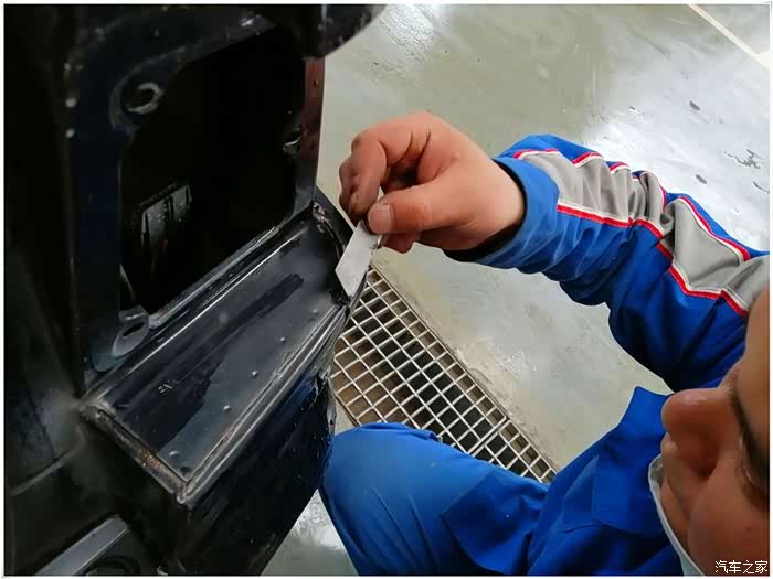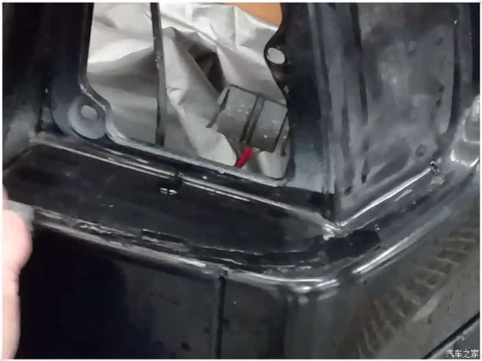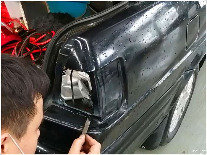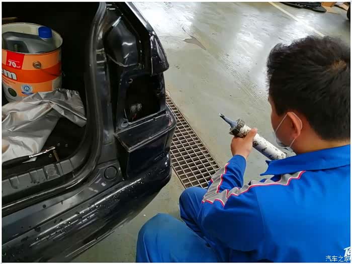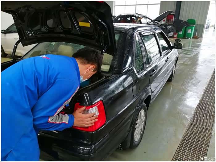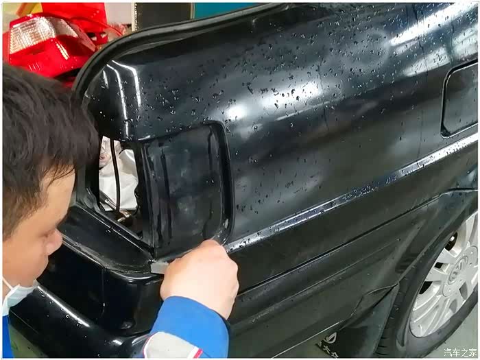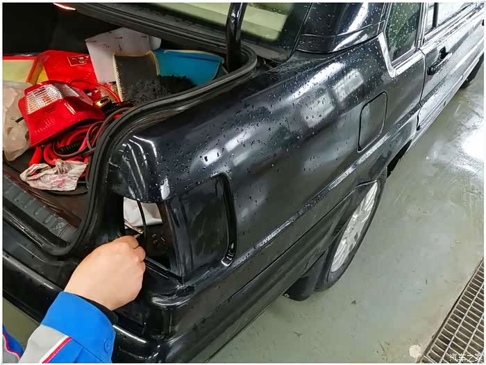 4S店的师傅又把后弯灯卸下查看,再次确认车体灯座部位是干的,说明不是灯的问题。忽然他发现,车体的钢板的接缝处油漆经久老化脱落。他拿起喷水壶从车外照准这个位置喷水,果然可以看到里面在渗水。到此,终于查明后备箱进水的原因。解决的办法便是打胶处理了。