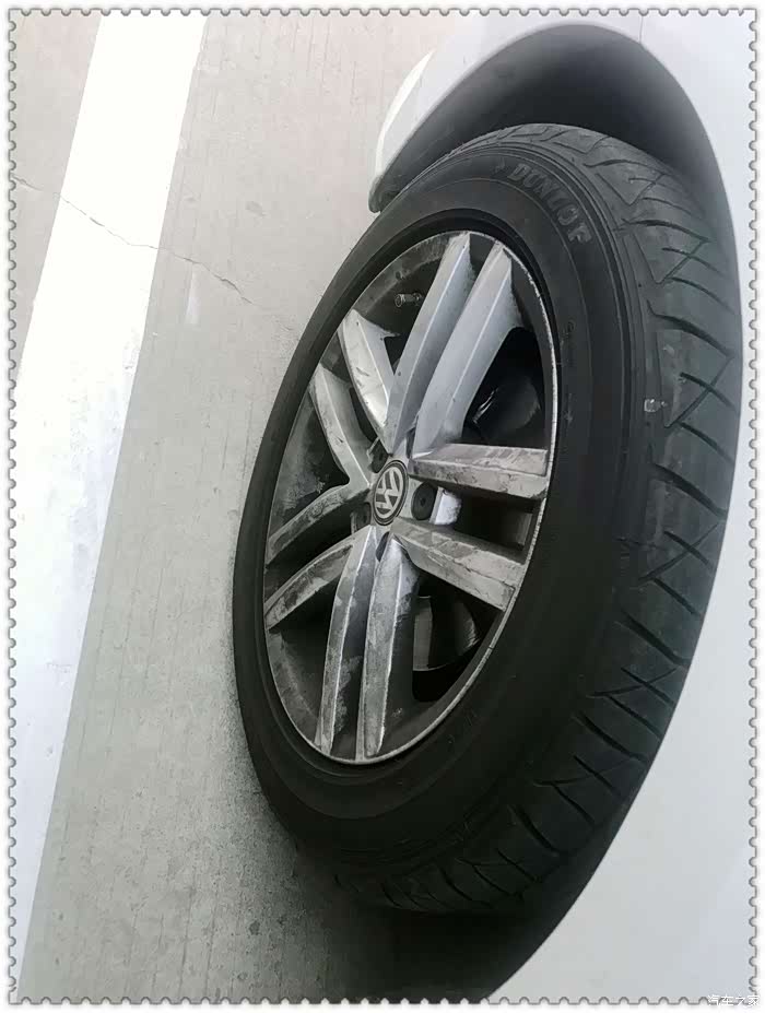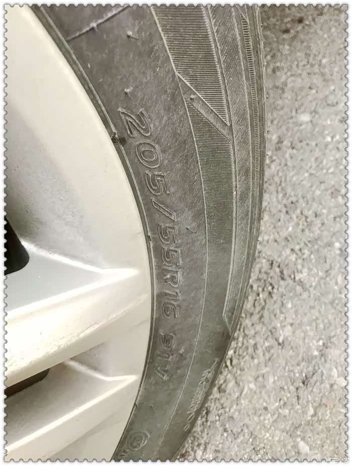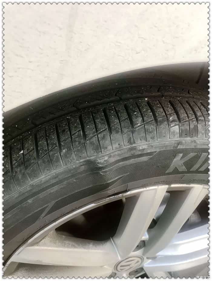 这次我要说的并不是给车子换了一身衣服,而是给他换了一双鞋子,这双鞋子的名字叫做‘轮胎’。一双堪比阿迪达斯、Nike的‘鞋子’。为什么换轮胎呢,起因是我的暴力驾驶导致的,又是在一个凄凉得季节本帅开着心爱的小汽车奔往单位,还有一个弯道就要到单位了,远看有同事这个弯必须拐的漂亮点,因为过于激动方向没有把握好,只听到咣当一声巨响,车子的右侧轮胎也不知道压倒了什么地方,经后查看是压到了马路牙子上,起初没有感觉有认为的问题也没对轮胎进行查看,但是在过了两天后在道路上行驶发现车子的胎压监测亮起了,此时我感觉到隐藏的危险扑面而来。