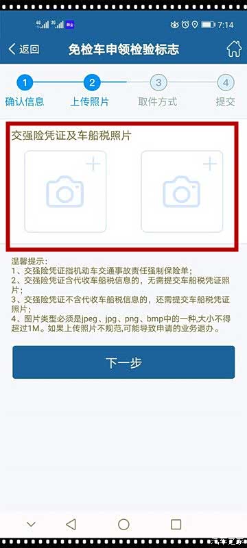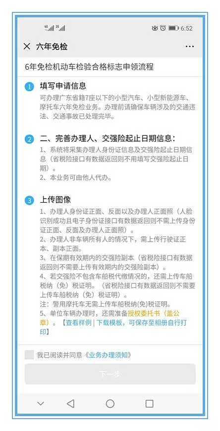 打开之后,就是一些相关的规定和规则。还有一些相关的要求。按照了相关的要求,做了准备,提供了2019购买的车辆交强险的缴费凭证、车船税的缴费凭证。并拍照就可以了。