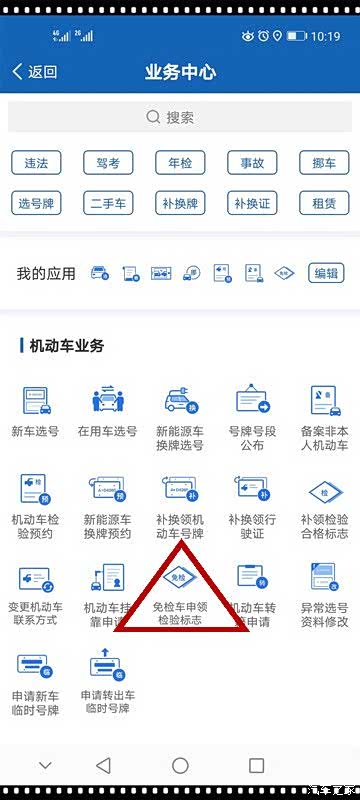 打开之后选择业务办理。就可以清楚看到免检车申请检验标志这个申请的业务。