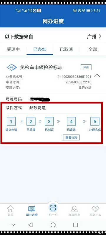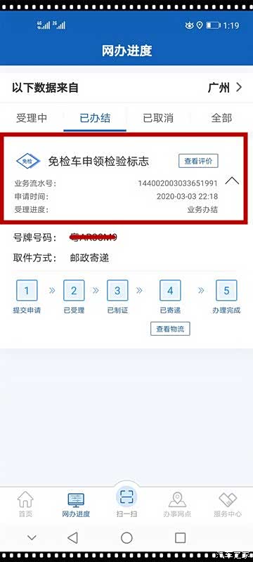 上传后,显示办理成功。等待车管所哪边审核。这个是必须选择邮寄,但是邮寄的费用是不便宜。市内邮寄费20元。在这个疫情还没有得到控制下。选择这个邮寄是明选的。