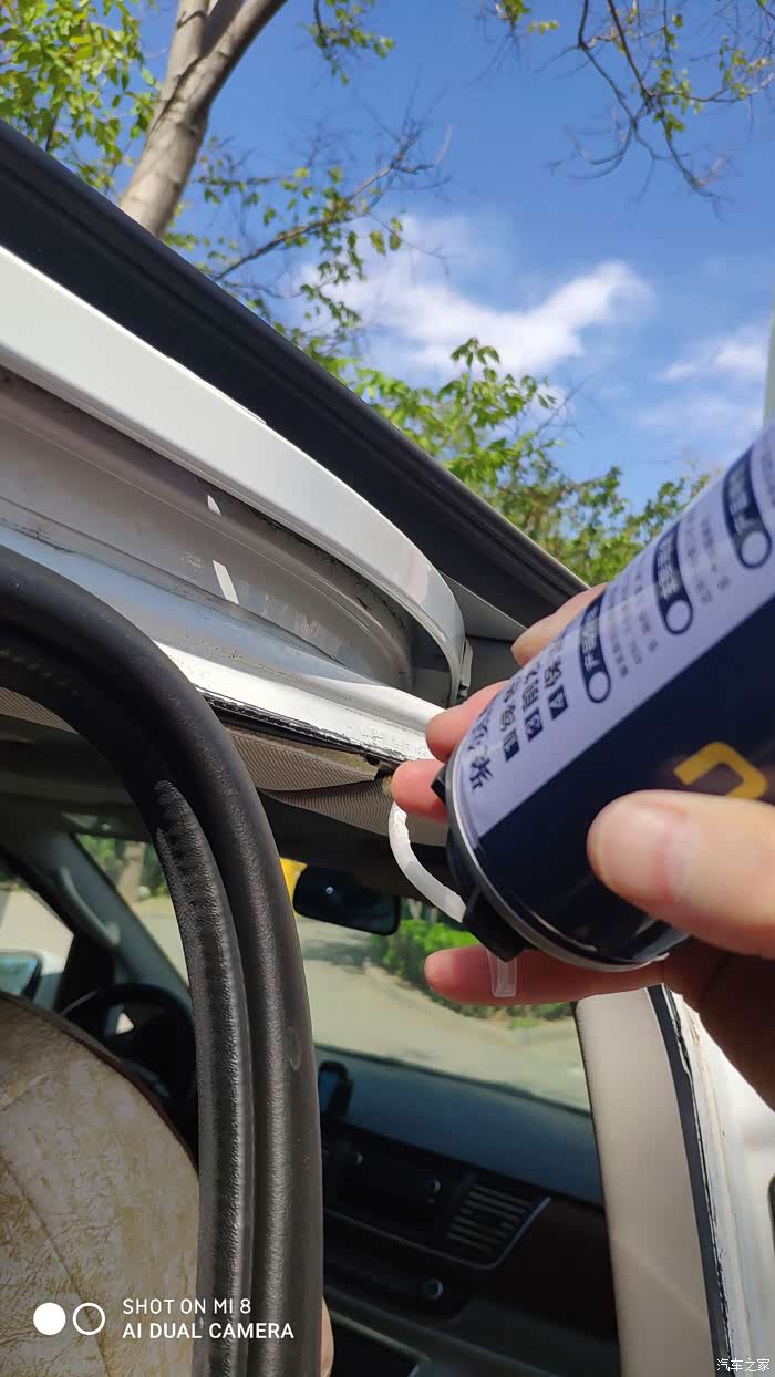 把泡沫胶充分摇晃后,将喷管对着内饰板里边没有隔音棉的地方,喷发泡胶。同一位置一次不要喷太多,喷管稍微调整位置后再喷几下。如此操作,把内饰板边缘与顶棚之间喷慢发泡胶。