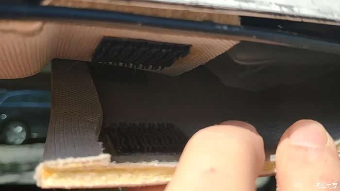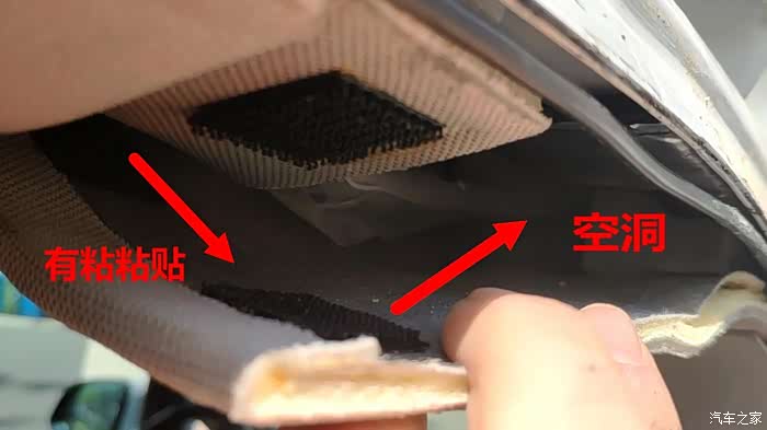 从这里往里看,这块内饰板边缘与后边内饰板边缘是有那种粘黏贴固定在一起的,再往里也有隔音棉,但边缘部分就没有任何阻隔了,估计就是没有隔音棉的部位产生的摩擦共振异响。