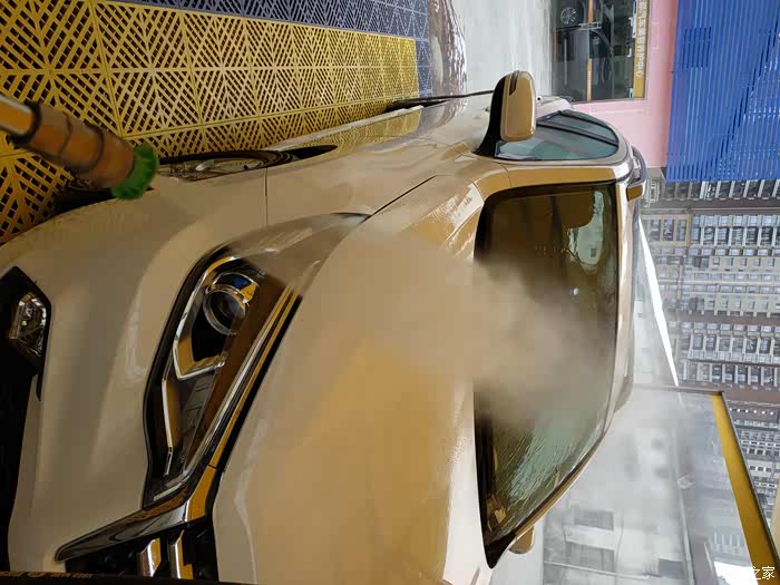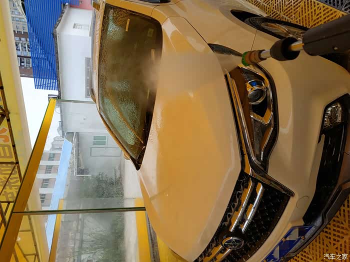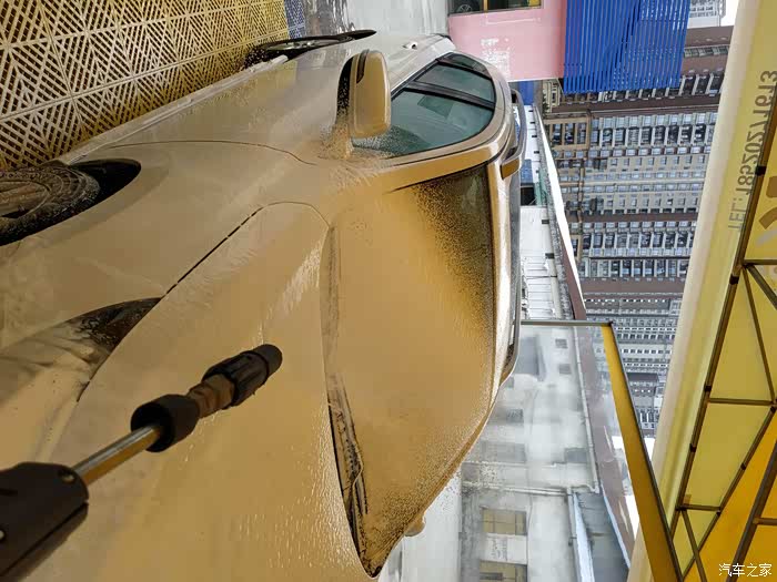 先要用高压水枪冲一遍,不要省水,可劲了冲吧,感觉就一个字:High,好像平时工作生活中的压力都能通过这冲水的过程缓解了。水一定要冲遍全车,这样后面上泡沫洗的才干净。