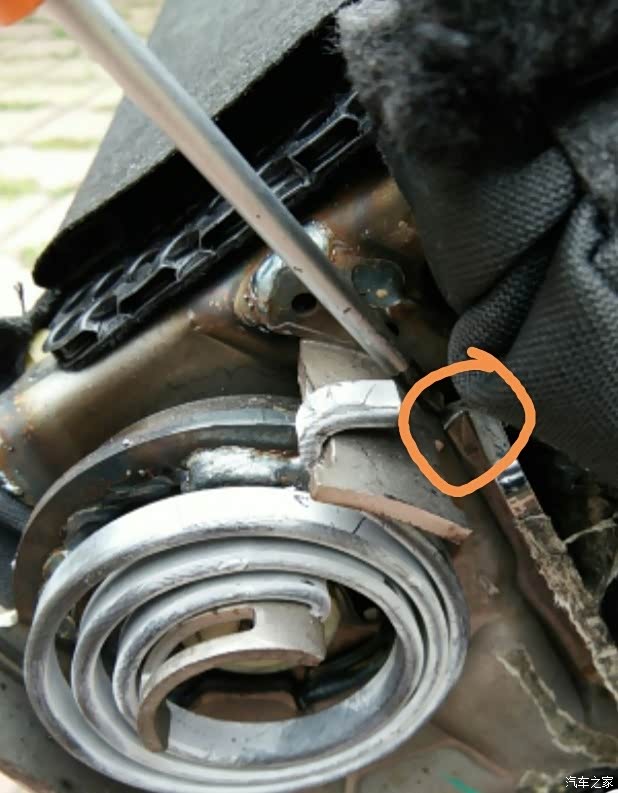 划线处是座椅一边卡扣卡死的地方。当然座椅另外一边也有。单边第二排座椅,有个金属卡扣,和另一块厚铁片卡死了,就翻折不了太大角度。咱们只需要把这个厚贴片,先用铅笔画好切割大小.建议旋角度观察卡扣运行轨迹。