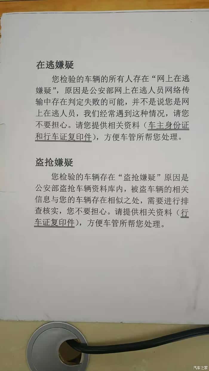 终于排到了最后一个窗口,即将打印检验合格贴的时候。工作人员告诉我出现一个问题,车辆所有人存在“在逃嫌疑”,不过立马告诉我不要紧张,这套系统存在误判的可能性,每天都有好些位车主遇到这种情况。解决的办法就是把验车人的身份证复印件和车主本人的身份证号码提交系统上传,没问题就第二天自动解锁,不过就是需要带着相关资料再跑一趟检测站打印合格贴了。无奈我就只好先回家了。