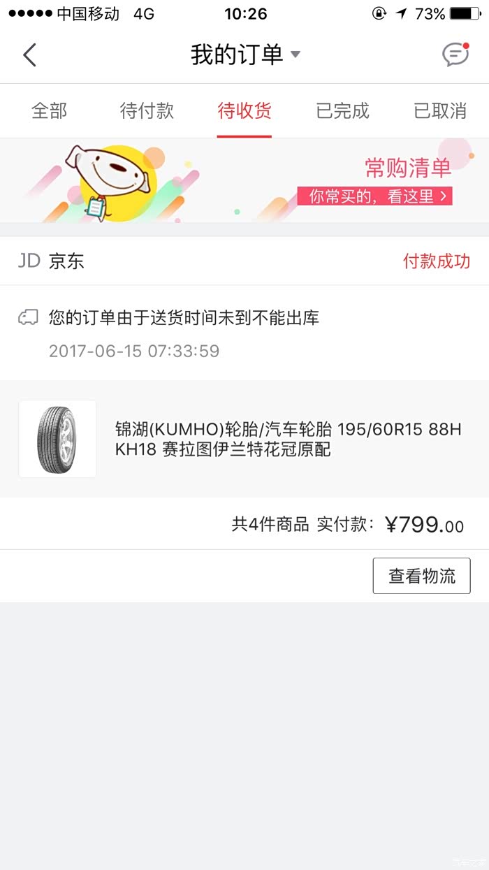 6月17日早晨,查看网上购买轮毂的物流信息,已经在派送了,八点钟不到我迫不及待的打电话给快递员,告知我今天送到,可是我等不及啊!因为今天要出远门,赶紧再一次给他打电话,然后我自己去物流点提货。轮胎在京东买的快递小哥很负责,早晨装货的时候给我打电话问我中午在不在家,然后中午快要到的时候又给我打个电话,确实很放心!