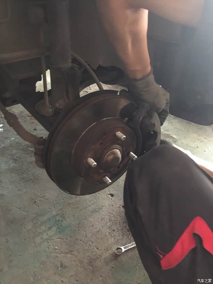 师傅在帮我检查刹车片,发现要更换了,立马换掉。