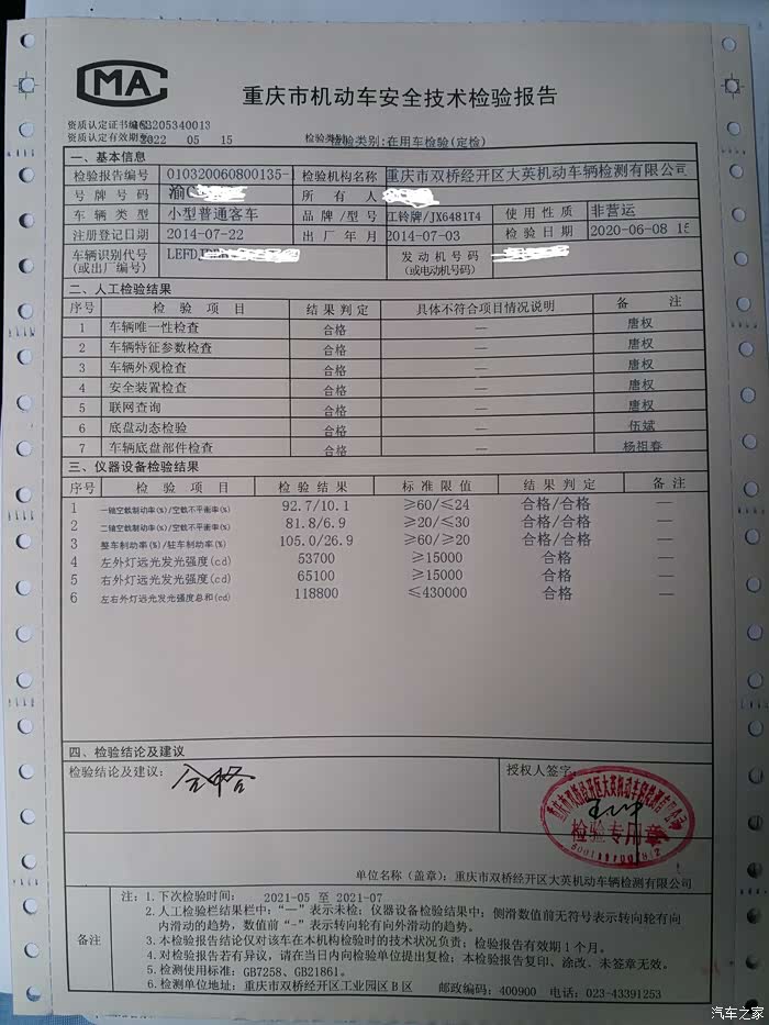 早起洗一下外观,趁下午雨停了,去检车。以为雨天人少,结果还多,排5列长队。等吧,一个人去,还要去填单交费,回来一看,被插队了好些个车,缴费处也人多排队的啊,费时不少