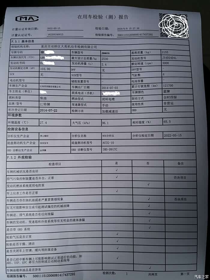 2014年7月提自动四驱七座驭胜,两年一审,今年该第三次年检了,根据前年年检经验,唯一难点在于手刹