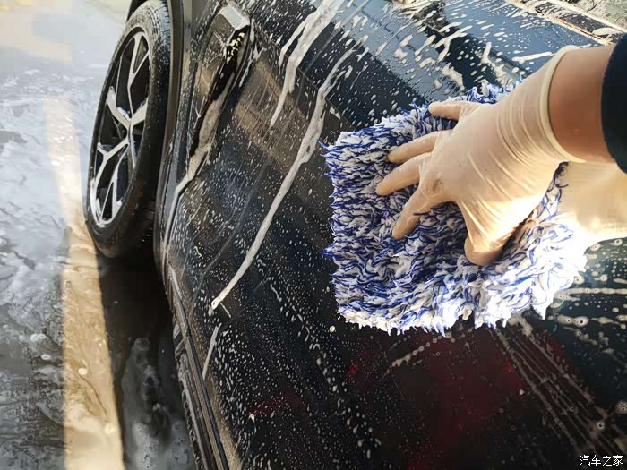 用洗车手套刷洗钣金面(长毛手套可以有效包裹沙子颗粒物,避免划伤漆面)