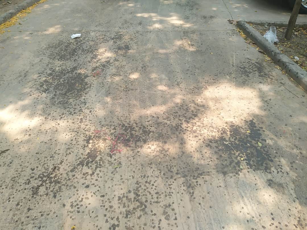地上黑色的就是从树上落下的树胶,走在上面还有些粘鞋子。