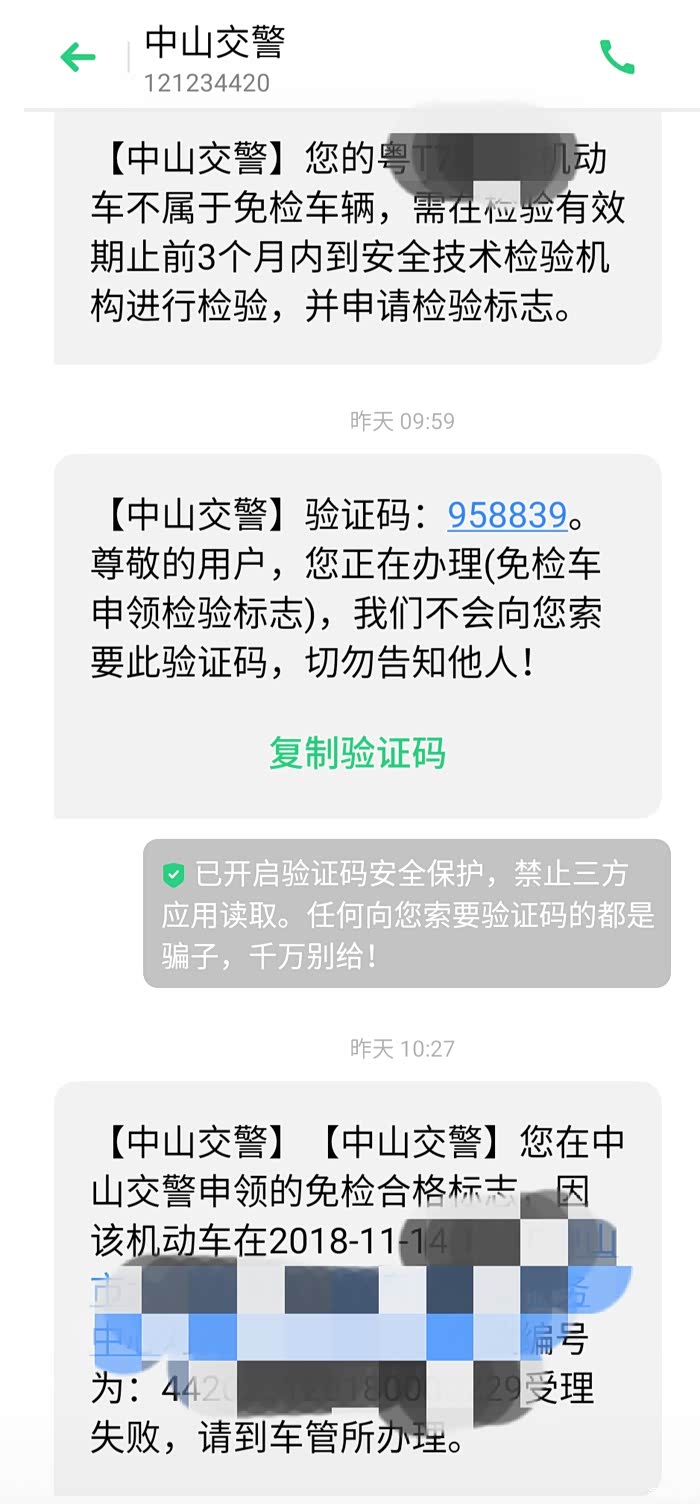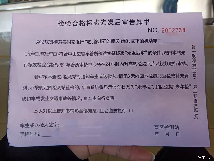 先科普一下,所谓免检只是免除上线检测,即便符合6年内免上线年检,还是每2年要申领合格检验标志的,环保绿标是取消了,合格标志可没免过!