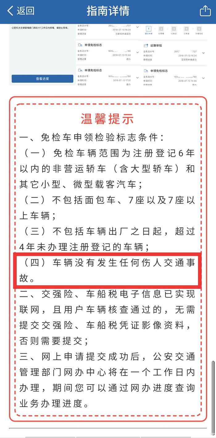 2、2012年9月1日以后登记车辆享受两次免检。2010年9月1日-2012年8月31日登记车辆享受一次免检。