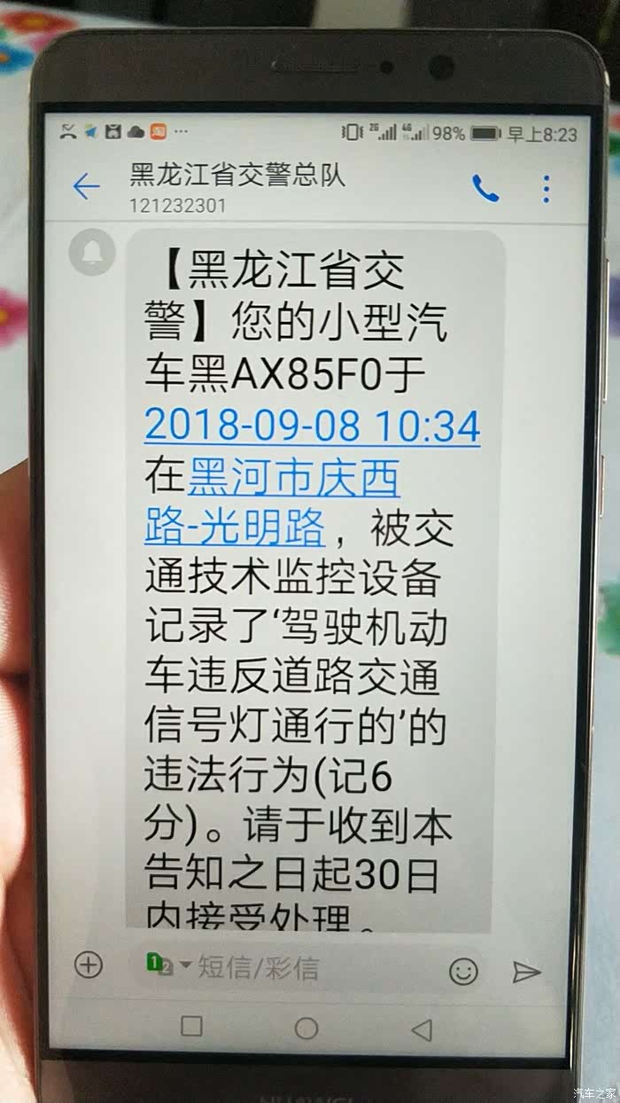 话说买车也快一年了,因为我本身就是一个遵纪守法的好公民,所以也没有几个违章,偶尔有那么一个两个违章都是接媳妇下班时候凑巧被拍下来的违停!!!!可是今天,接到了一条违章短信,使我不淡定了起来!因为这个违章是出现在黑河市!!!黑河?我从来没去过啊?那是怎么回事?我的第一想法就是,完了!被套牌了!因为我也没去过黑河啊!第二个想法就是,赶紧去交警队看看怎么回事,不是我车也得报备啊!我可是A证,不能扣分的,而且还是个六分!!!!