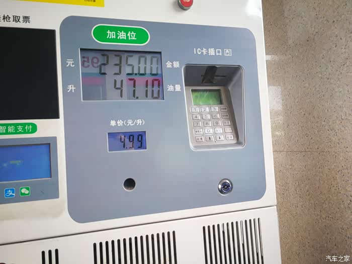 顺便给小五加满油,235元,47升,加满了,咱们小五的油箱是50升