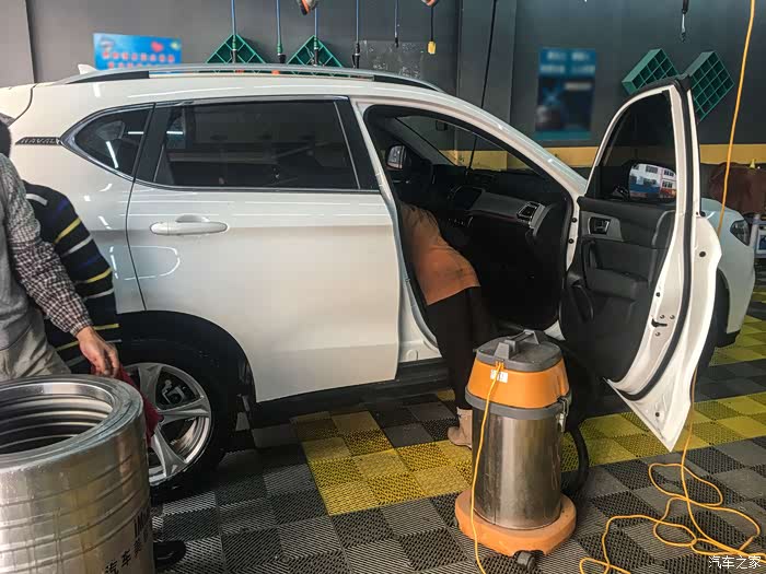吸尘机来了,对着车里一顿猛吸,什么小碎片和灰尘都被吸走。