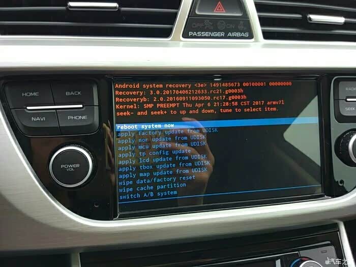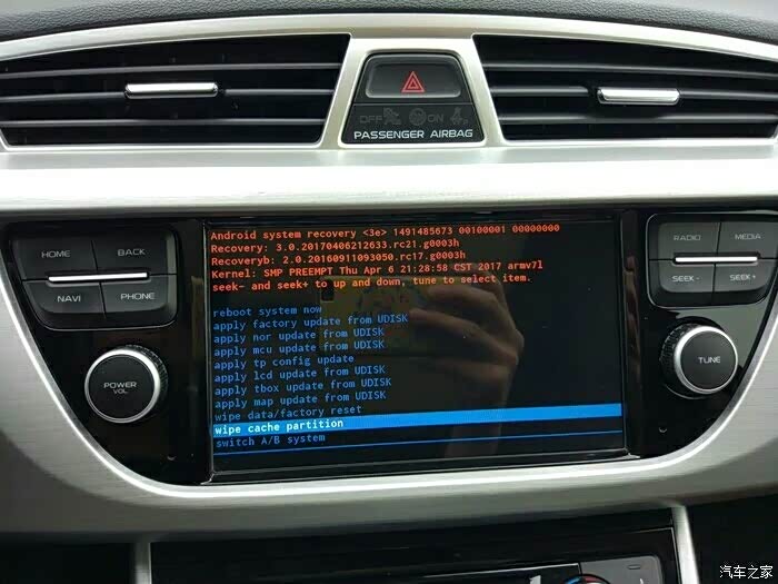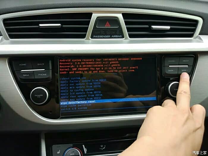 SEEK+向下移动选项,选择wipe data/factory reset 【清除内存,回复出场】如果不想回复车机出场设置可忽略此步骤!