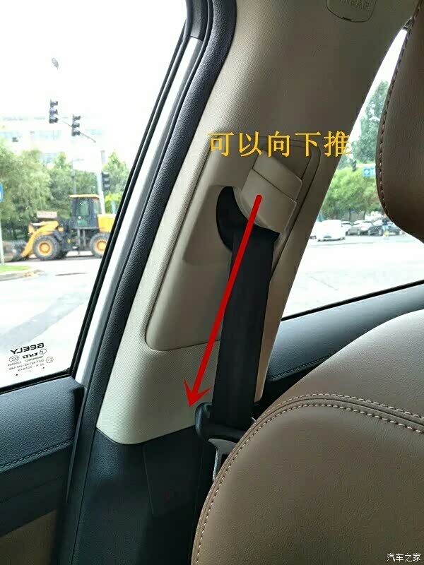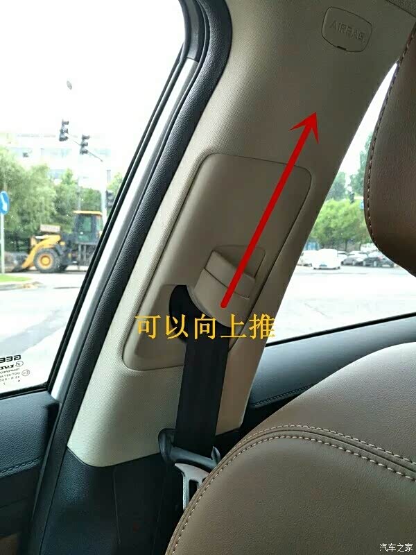 如果开车时候觉得安全带位置不舒服,可以调节B柱的调节开关。如图,安全带固定在B柱的这一段是可以调节高低的,按住开关就可以上下移动。