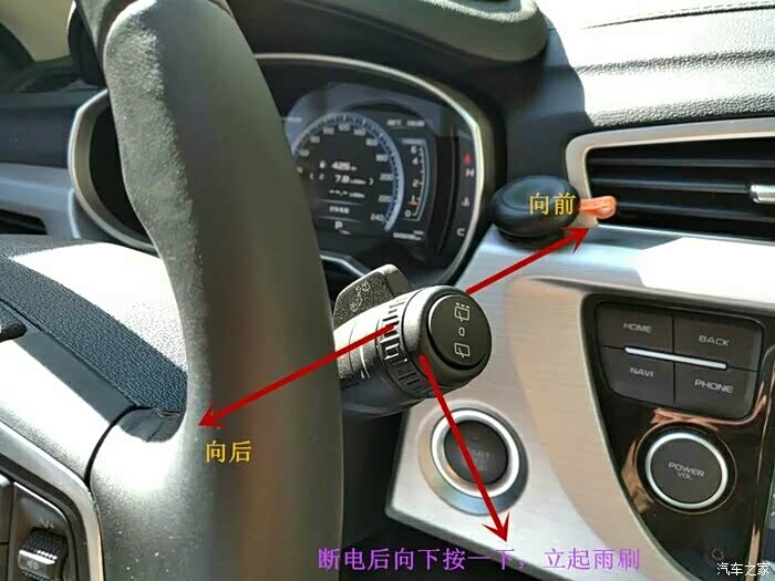 只需要停车时将雨刷控制杆向下推一下,如果已经停车断电了也没关系,先按两下启动按键让车通电,再按一下断电,这时快速向下按雨刮器控制杆。