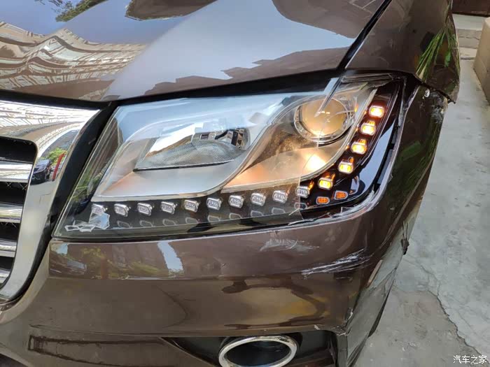 左前大灯透明灯罩破损--(经测试近光/远光/转向LED灯功能都正常)。