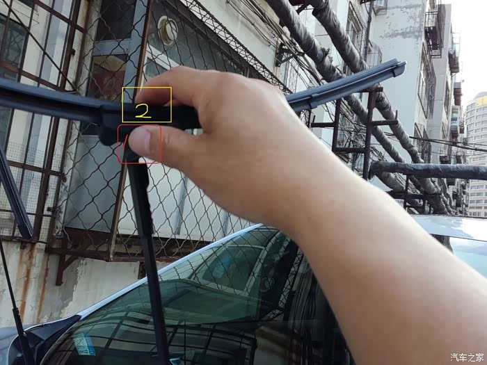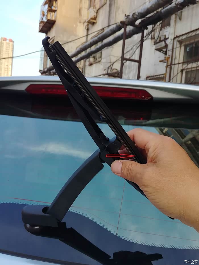 竖起后雨刮,沿红色箭头方向,拔出。