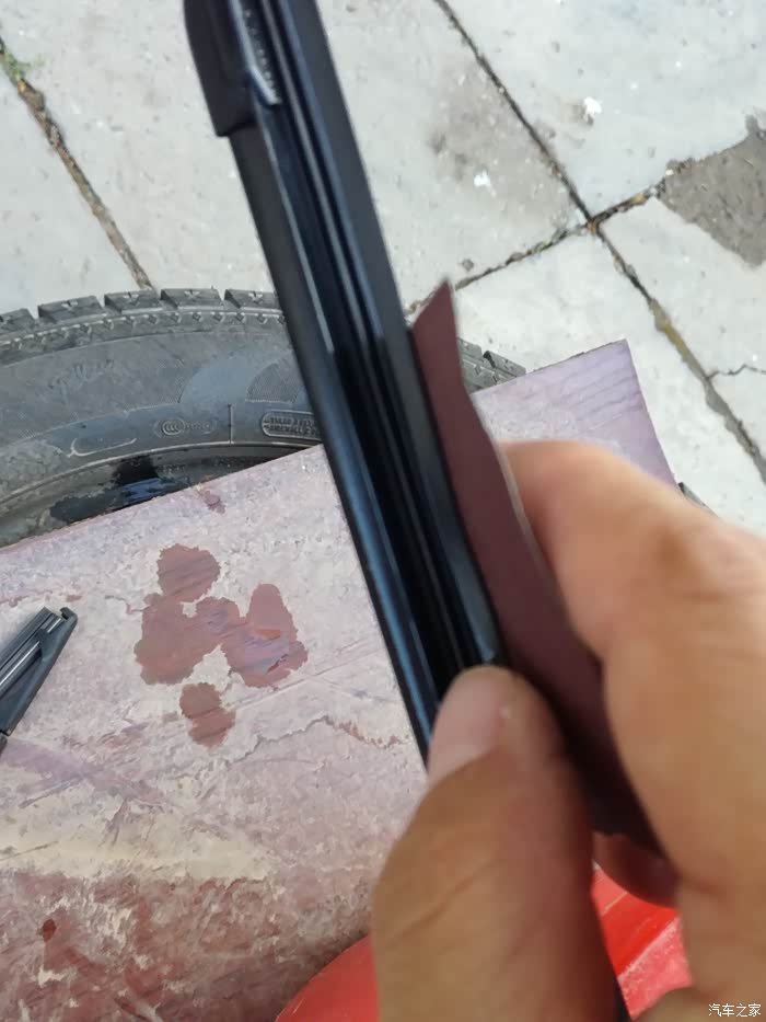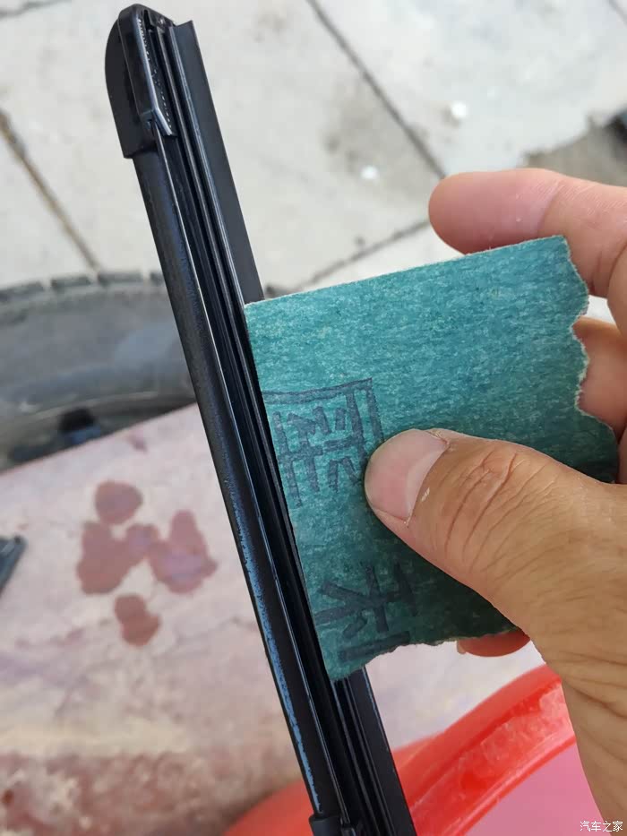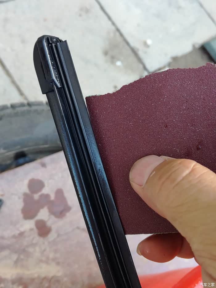 最后砂纸与雨刮条的正面进行打磨,千万记住沿一个方向,同时保持湿润。