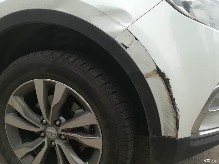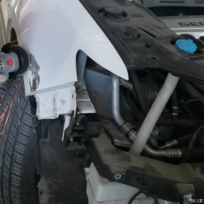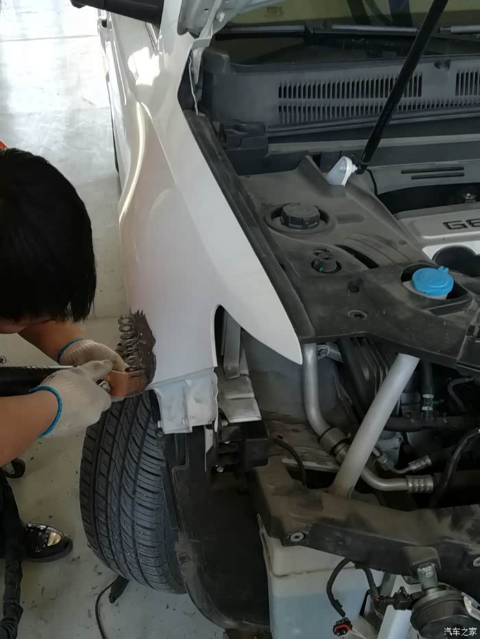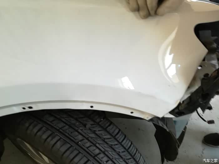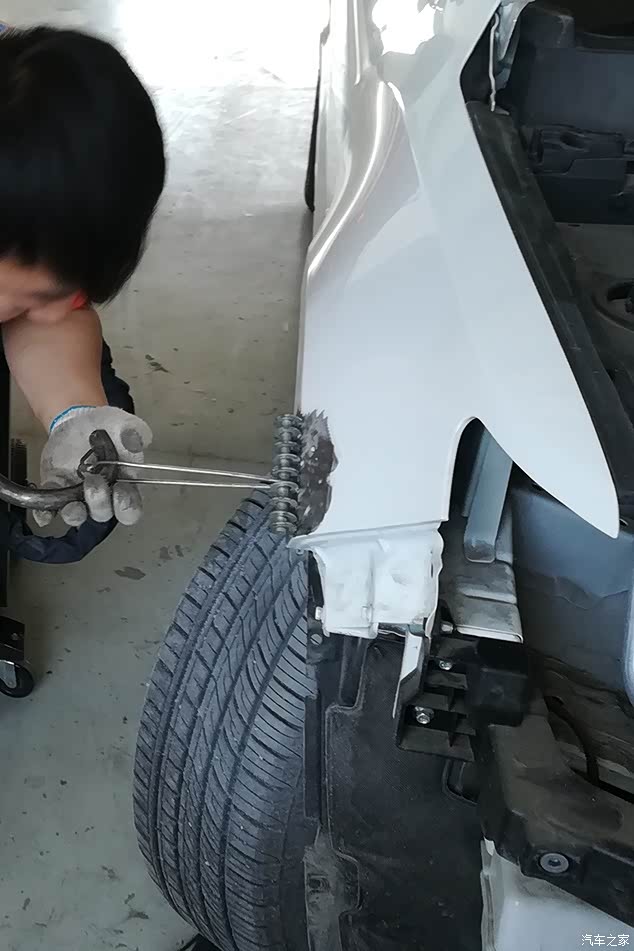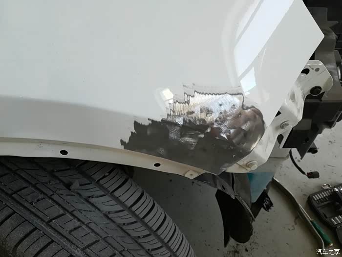 拆头灯,翼子板的凹坑清晰可见。