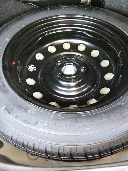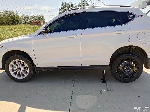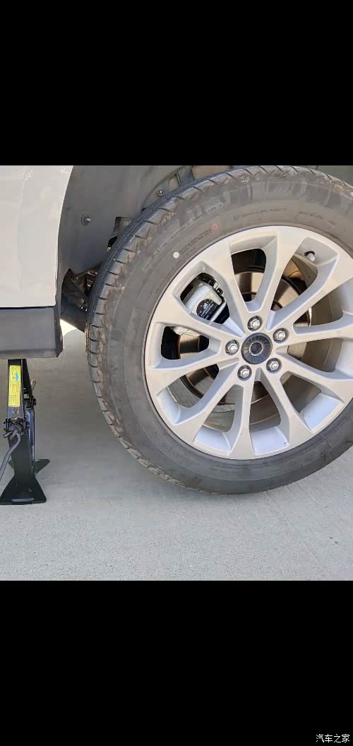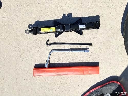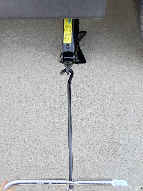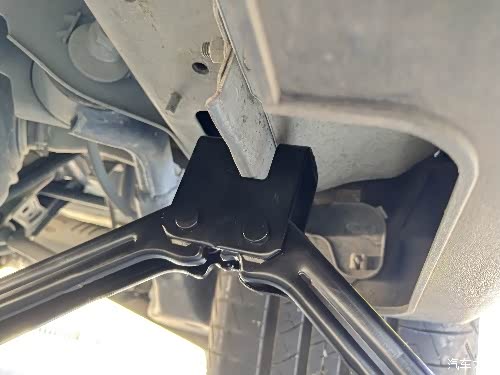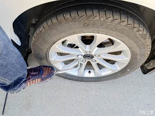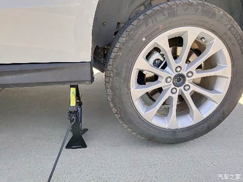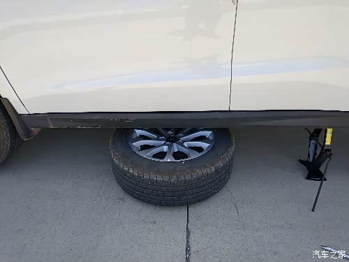 3从后备箱中找到千斤顶,寻找左后轮低盘千斤支点,把千斤升起,这时把轮胎螺栓松开,支起来轮胎自由能转动,取出螺栓轮胎拿下来。