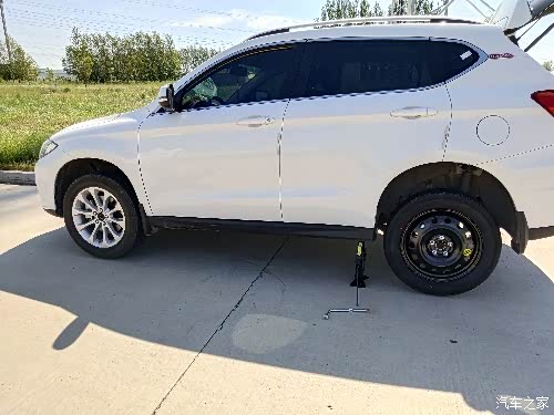 2先逆时针旋转左后轮胎螺杆,每条螺杆松开二扣方好,这样是为了在支起千斤后螺杆方便拧下,从备箱中取出哈佛h2备胎,放在左后轮胎旁。