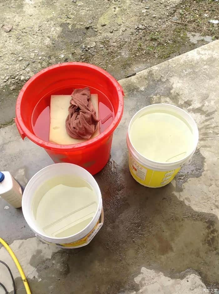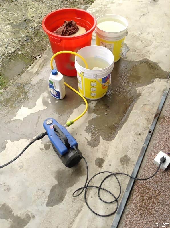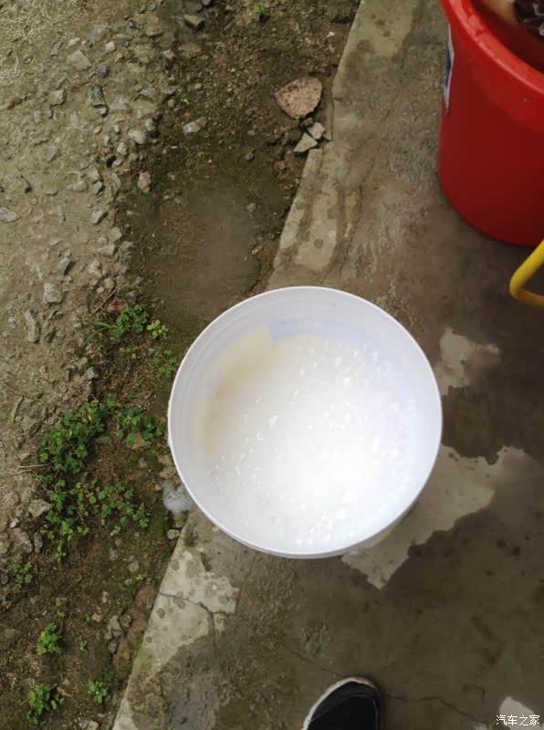 用水蜡兑的泡沫水,泡沫还是蛮多的。兑好之后就开始往车上喷了。