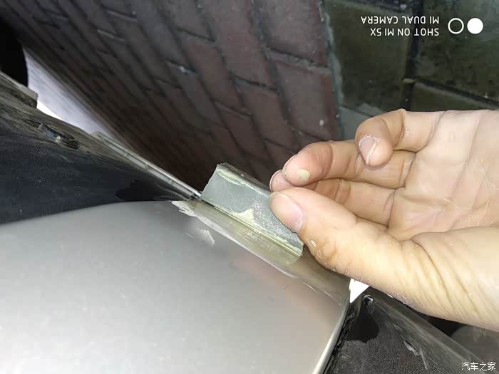 刮伤的位置这样施工相当方便!这时候这个海绵发挥作用了,把砂纸围到海绵上,然后用水进行打磨,没有水的话不好打磨,开始进行第一遍打磨。