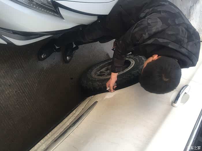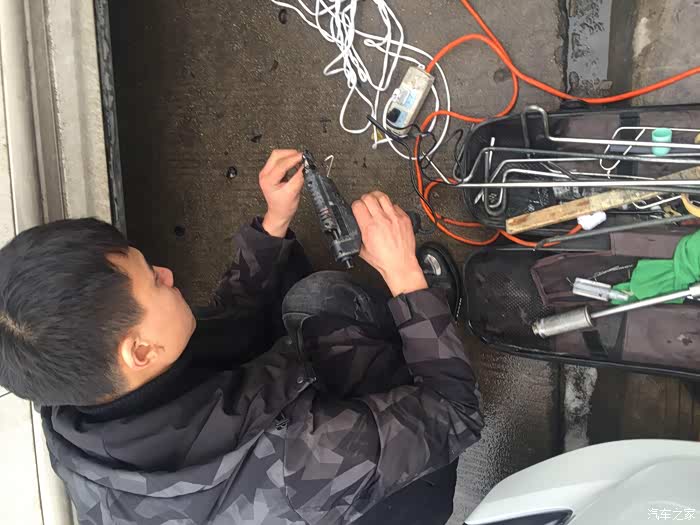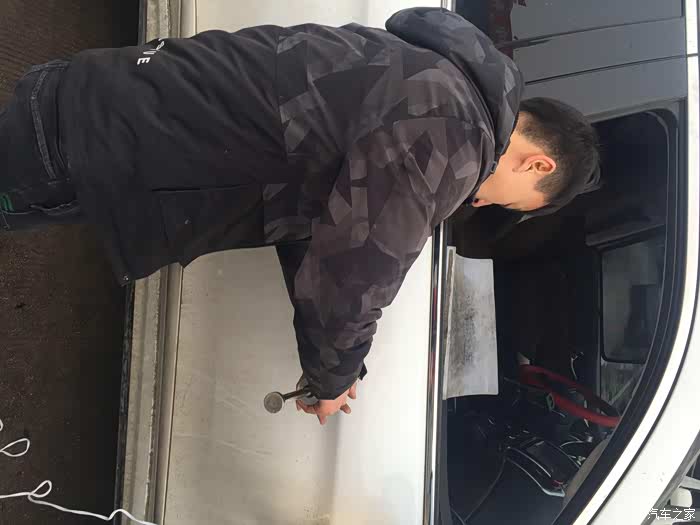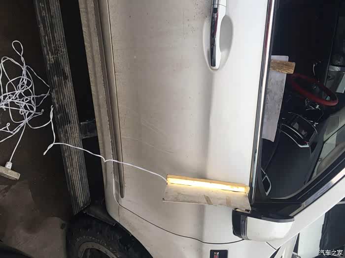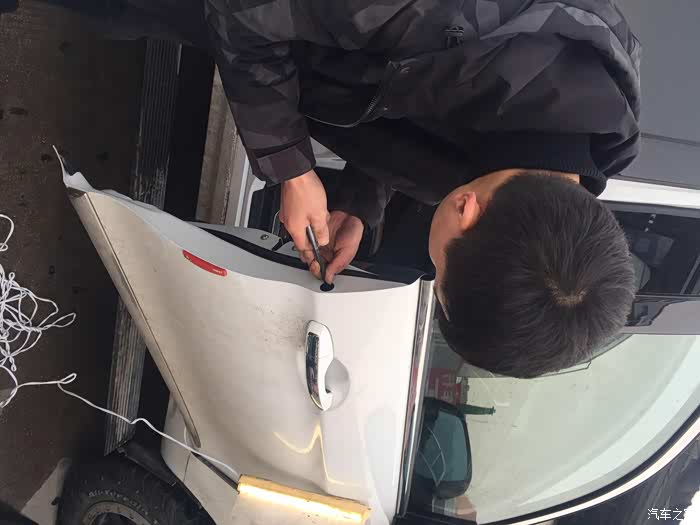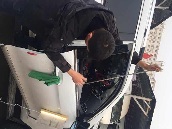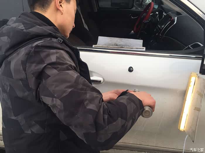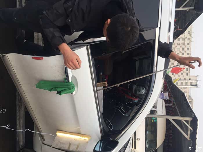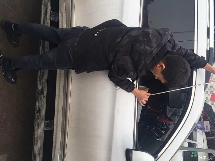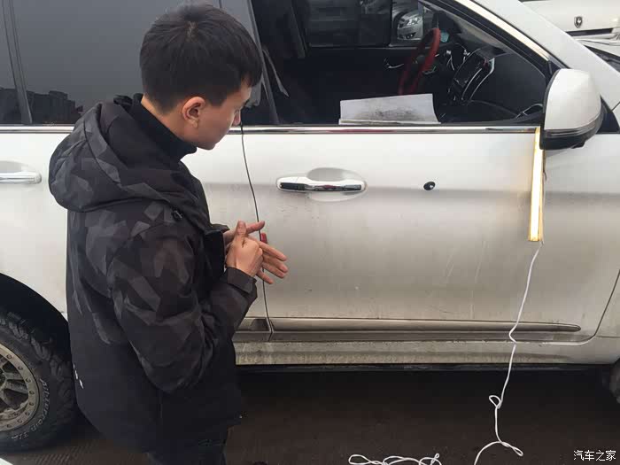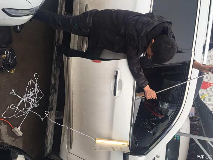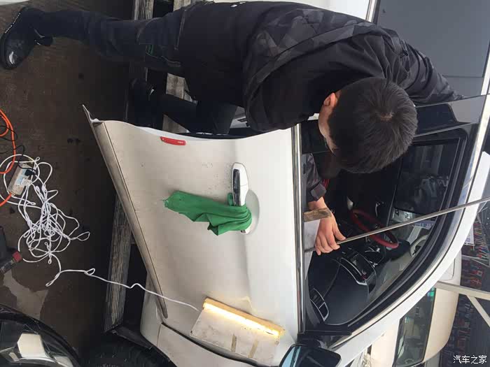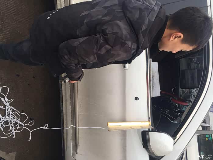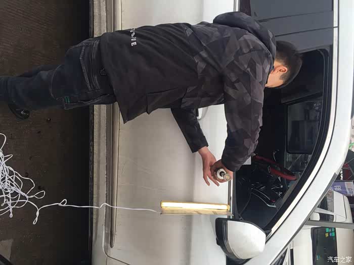 下面就是本次施工的小师傅,动作熟练连上电源,自制的强磁条灯,并用纸板保护好车门玻璃。