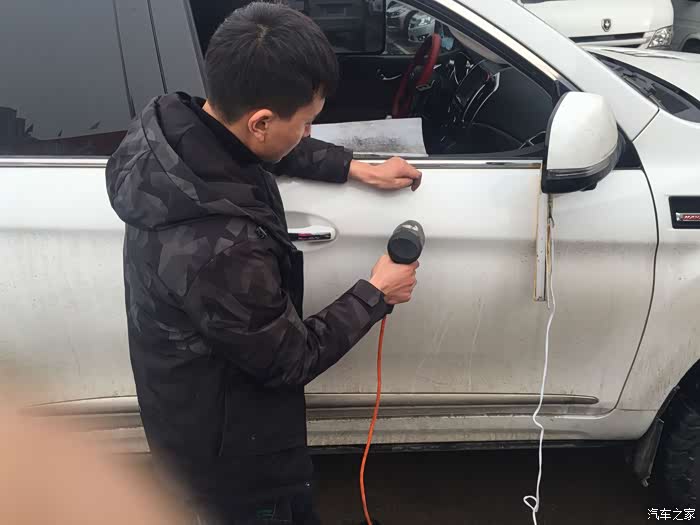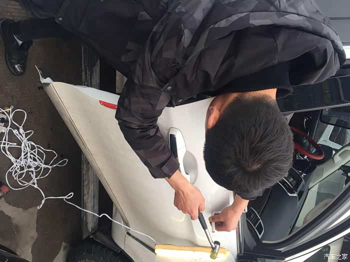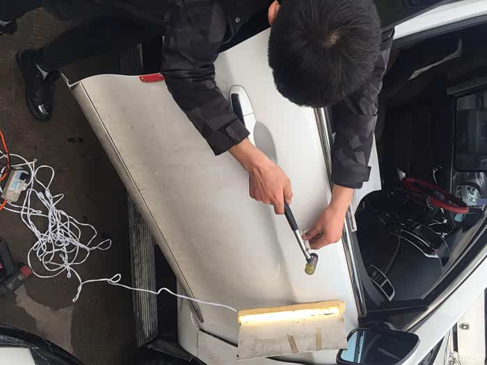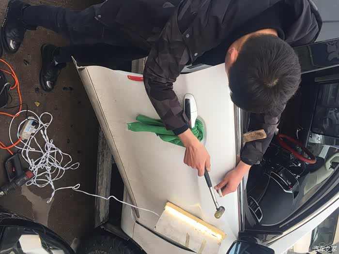 通过交流慢慢了解凹痕修复也是局部一点一点调整,拉拽好一个部位后用小锤再渐渐找好角度。