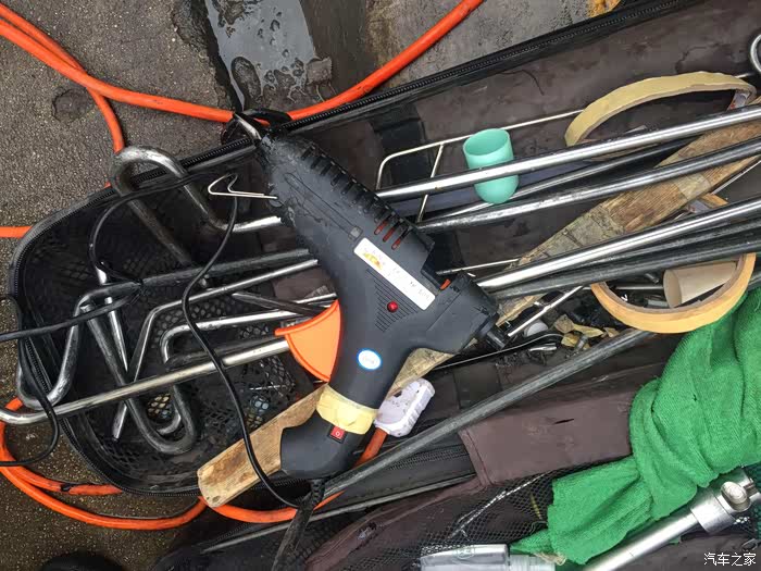前期的工作开始加热胶棒用来固定拉拽凹痕,地面上都是加热前期的废料。