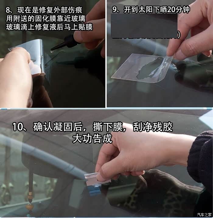 整个前档玻璃 需要3个小时左右,固化的时间比较长,太阳光比较大的话,可以适当缩短一下时间。整个过程需要注意的是玻璃修复过程中----抽真空 加压避免阳光的直射。防止修复液固化过快。玻璃修养的要点就要让修复液融入到裂缝中。今天的前档玻璃修复就已经大功告成了。感谢小七风里雨里的陪伴,为我遮风避雨,也收到过伤害;再次祝愿各位车友 车长安,人长久!