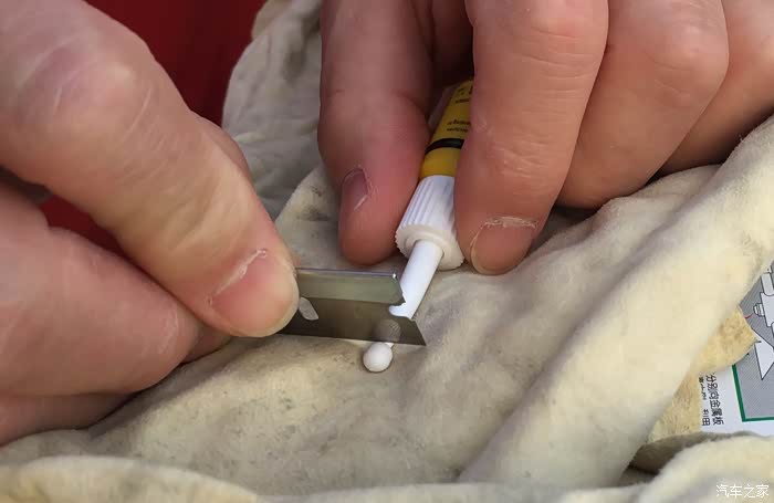 使用刀片切开修补液瓶口,滴入4-6滴修补剂在压力筒内。