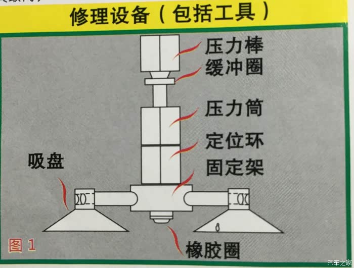 B将压力筒上的定位环旋转至压力筒的螺牙根部,然后把压力筒整体旋紧到固定好的支架,让底部的橡胶圈与玻璃接触压平目橡胶孔要对准破损点,此时橡胶圈的凸起缩回且气缩小。