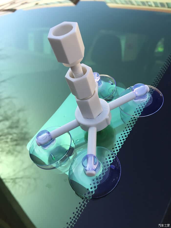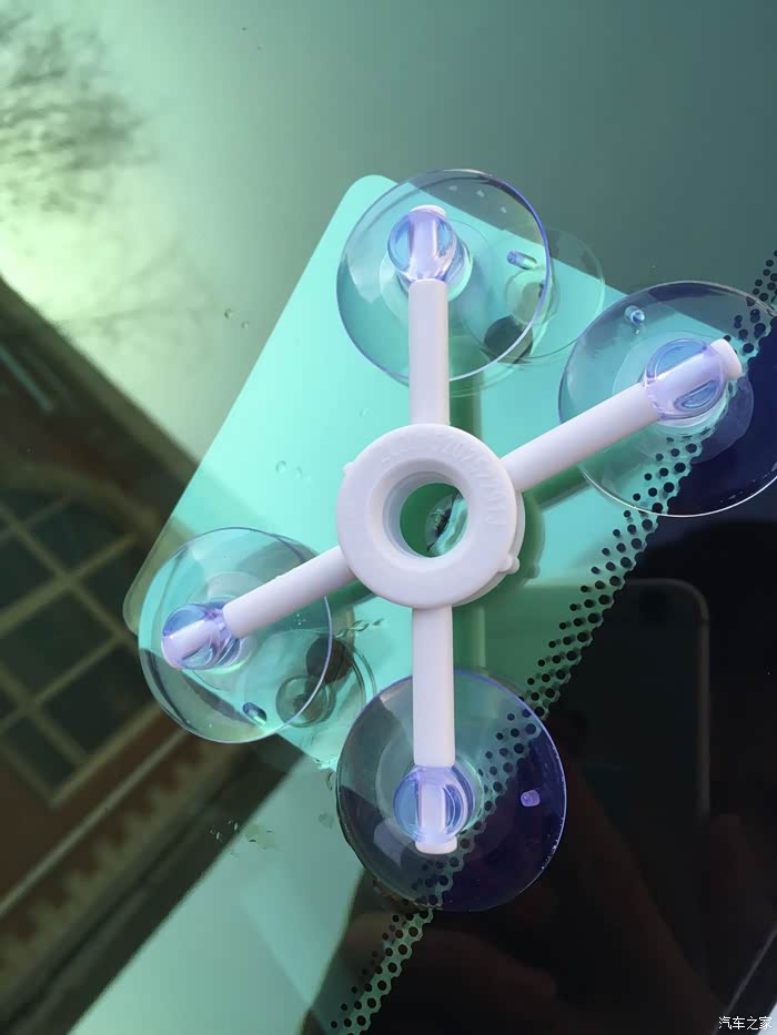 A将支架中间孔对准破损然后固定四个吸盘于干燥的玻璃表面