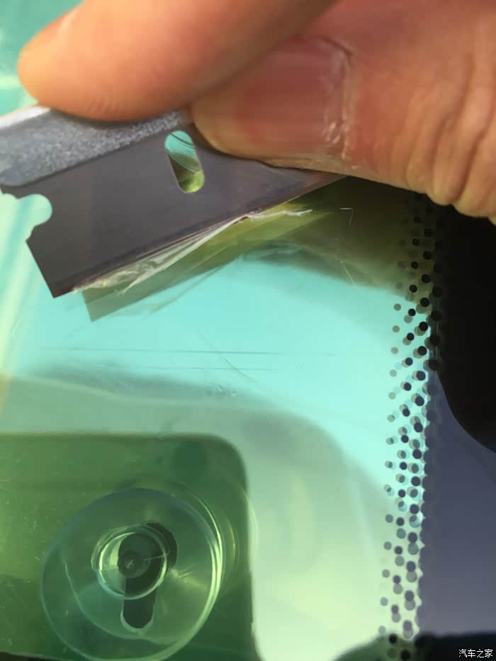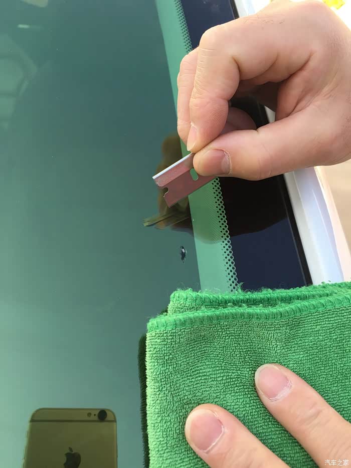 撕掉治理固化膜,用刀片与玻璃成45度的角度,刮除玻璃表面多余的硬化修复树脂,完成修复过程。