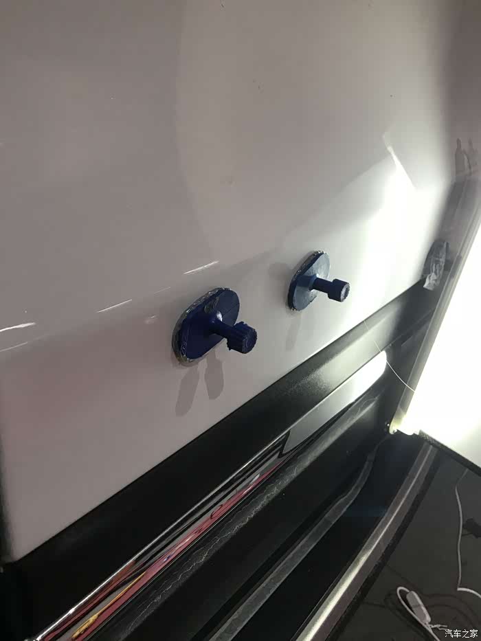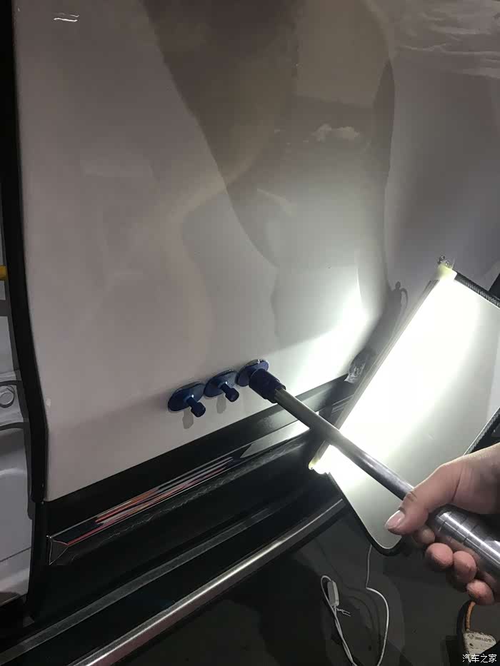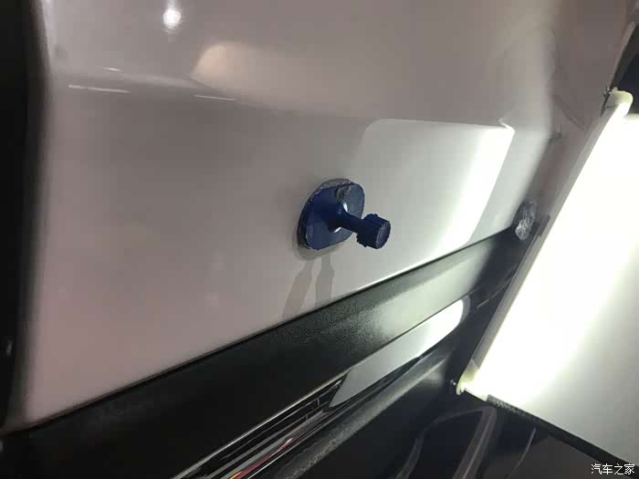 然后在高光灯的帮助下,找凹陷部位,立即粘到车身凹陷处。