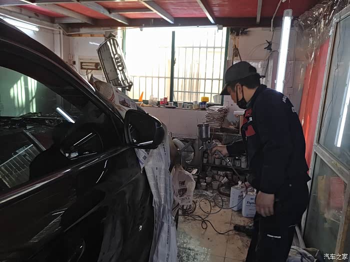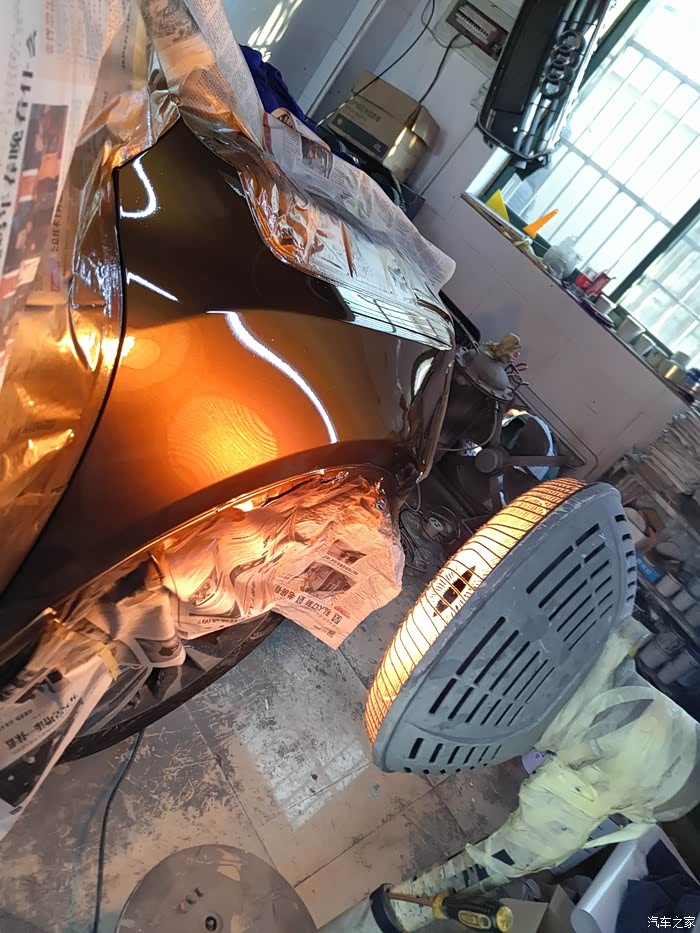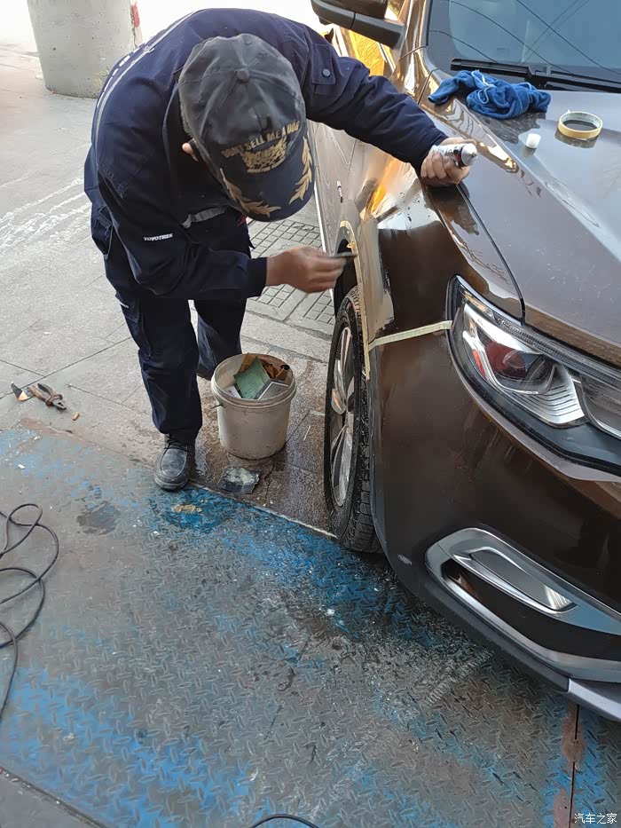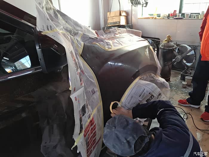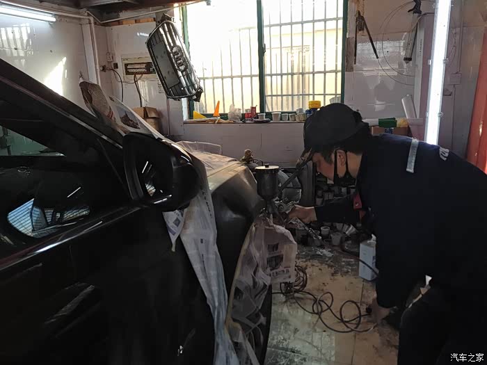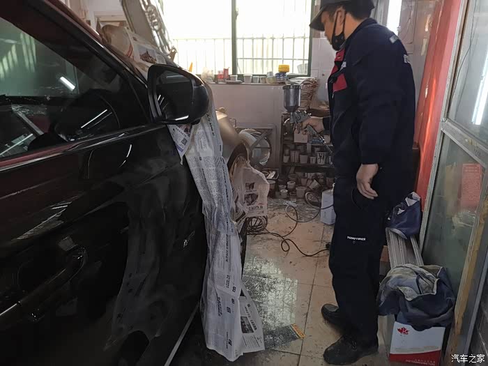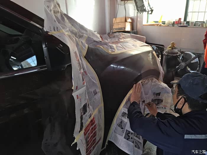 需要遮盖住其他部分以免喷到油漆,这里老板又做了一次“整形”,其实我早已看不出瑕疵了,一般修理厂没这等待遇吧!