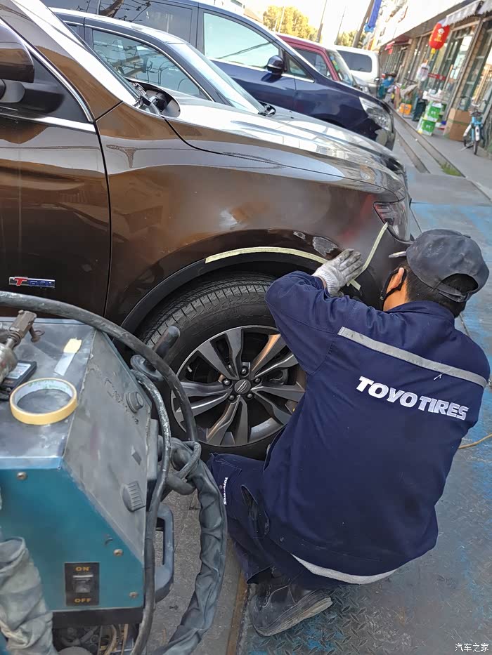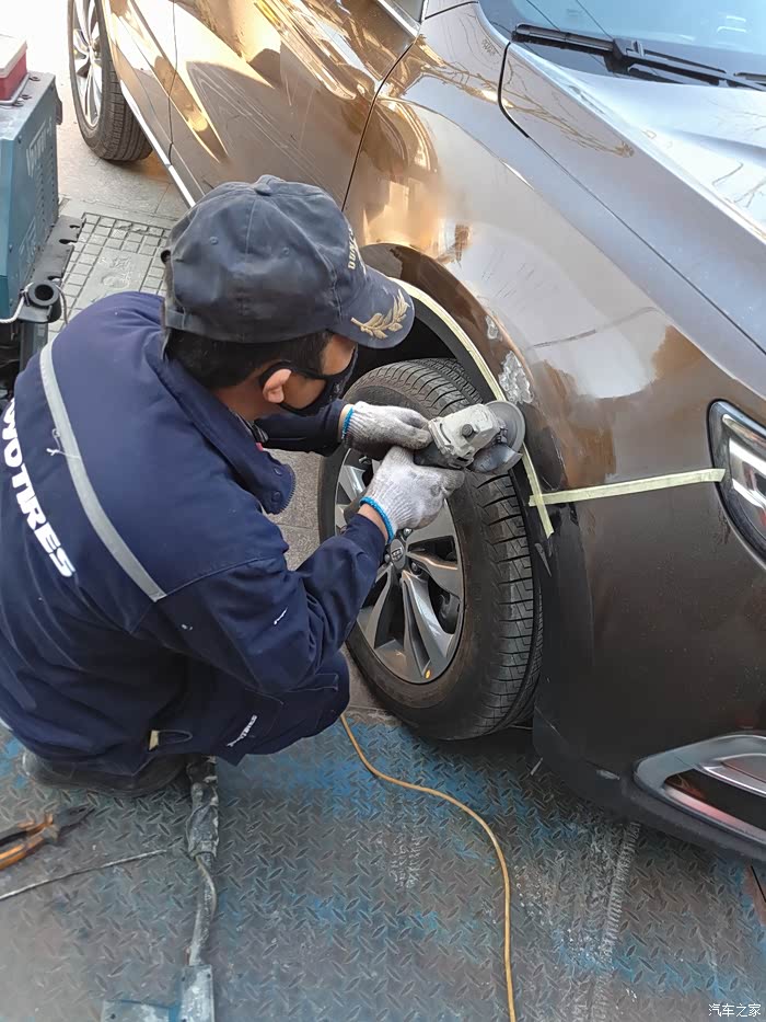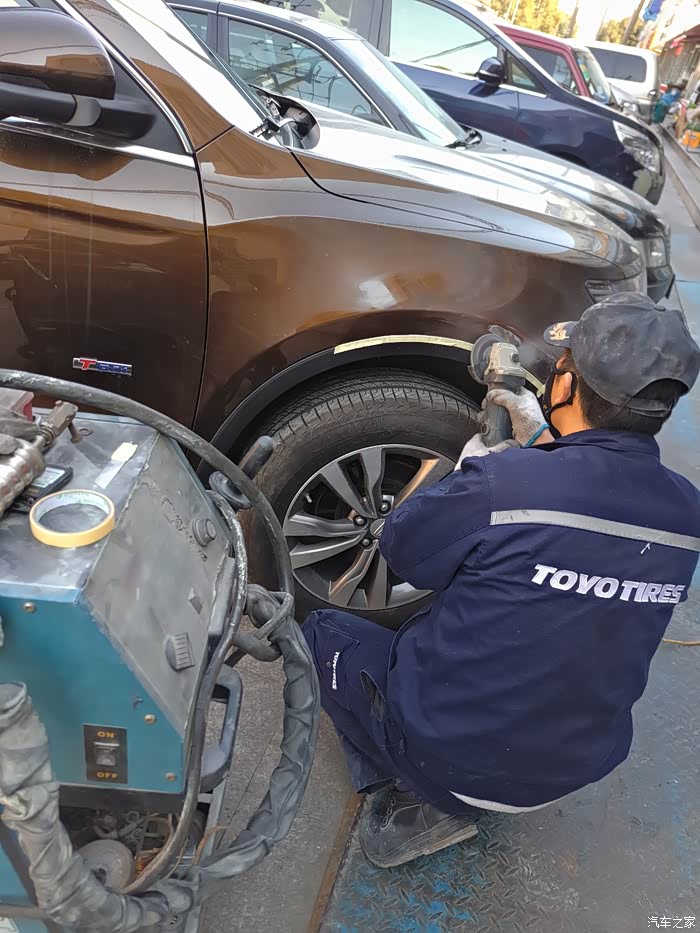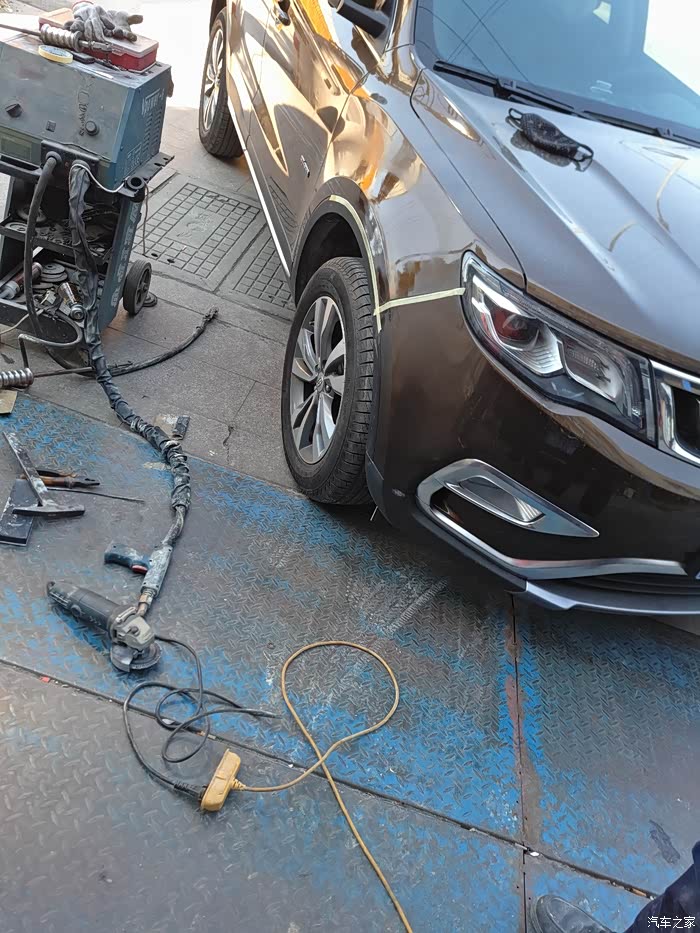 这就是钣金修复了,先是焊枪定位,这就是为什么要打磨掉油漆的关系了,博越的车壳子很厚实哦!