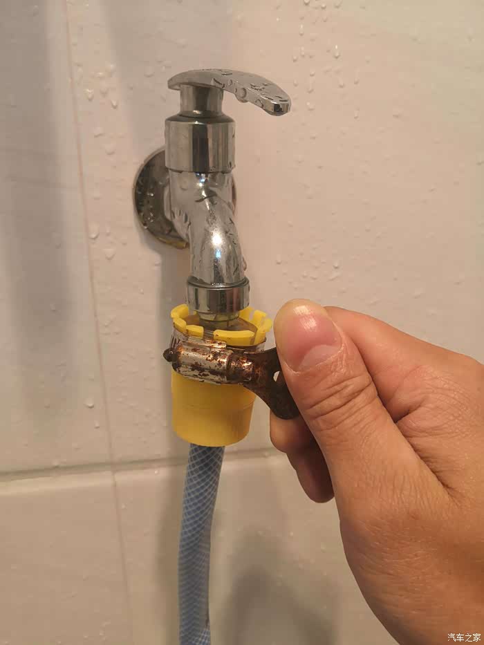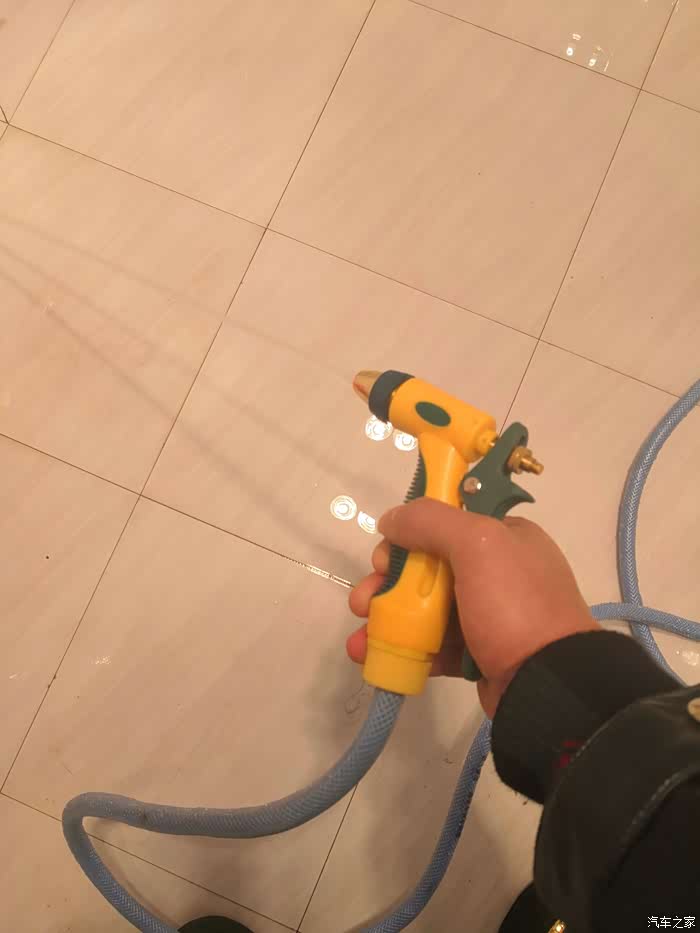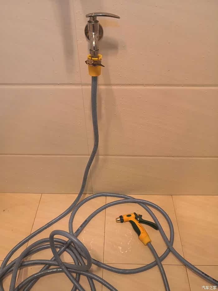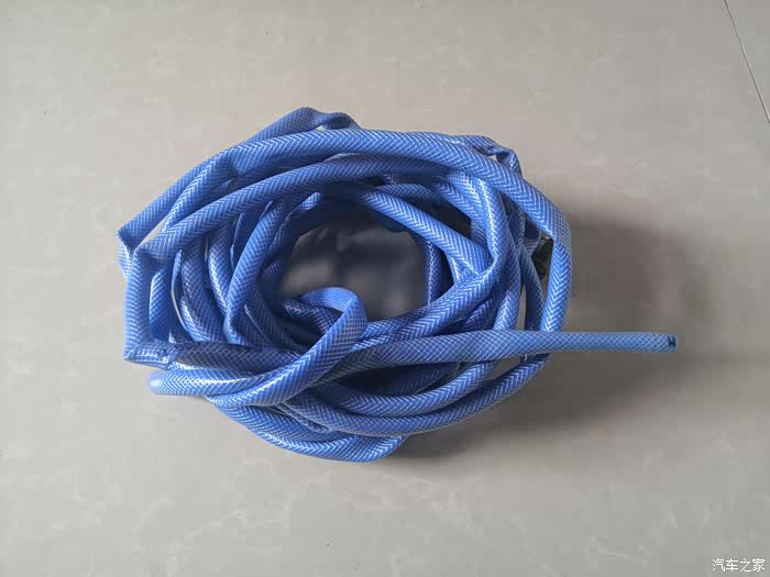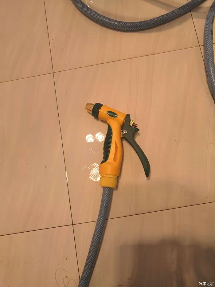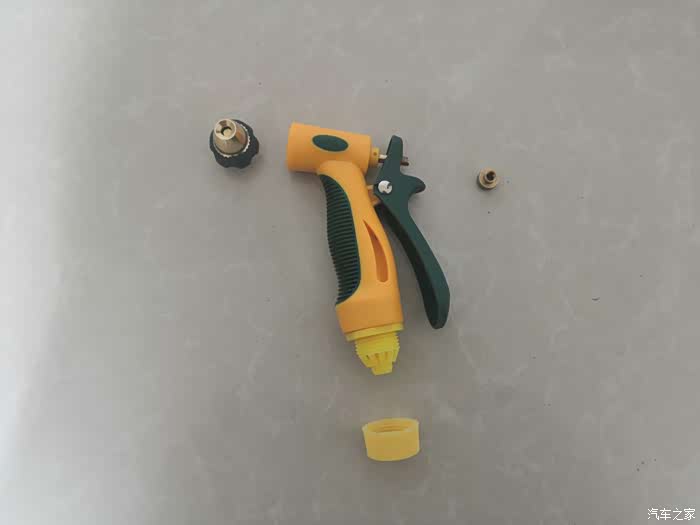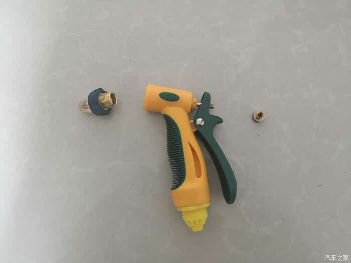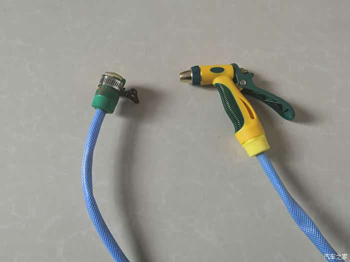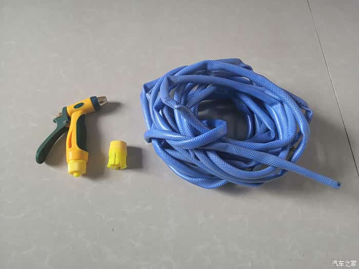 一条水管,三个接头,一把水枪都连接上以后就可以出水使用了。在使用家用洗车水枪一定要注意它的水压,如果水压比较大就不要对着人喷射,也不要用手去触摸水花,小心高压的水花冲射伤人。