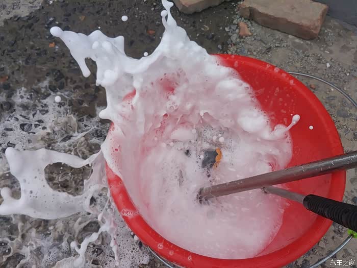 水蜡,倒入一盖的量,然后高压水枪滋水打泡,大概到桶的三分之一的位置刚好,这也是一个技术活啊,不小心就洒到外边了。