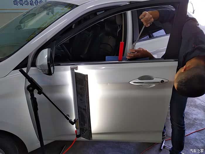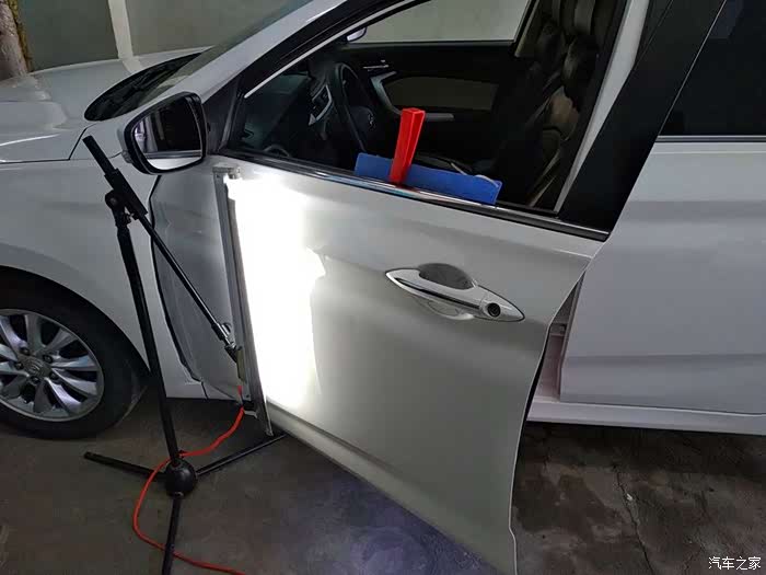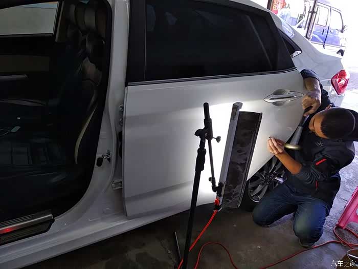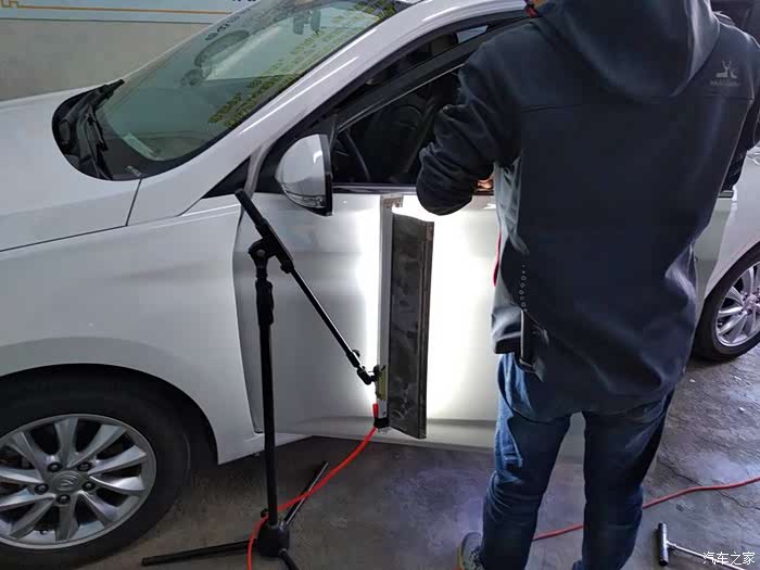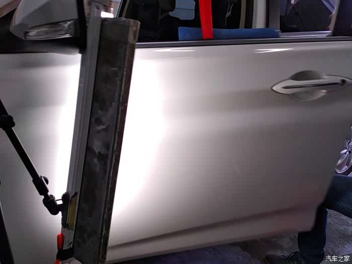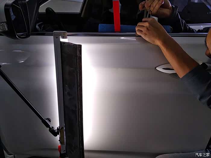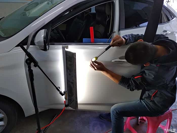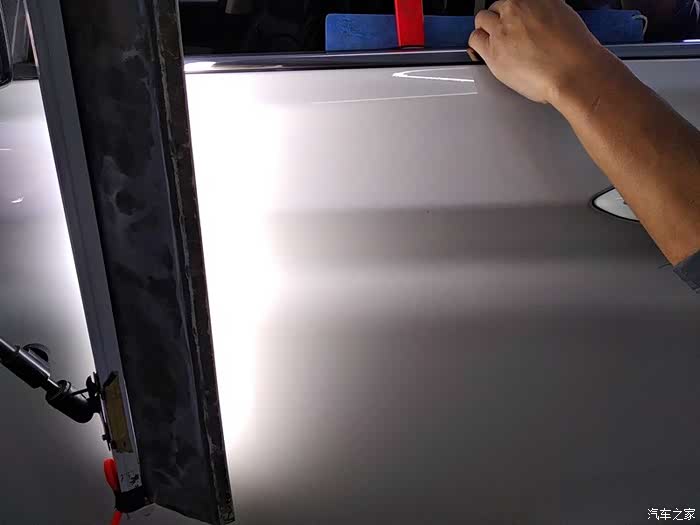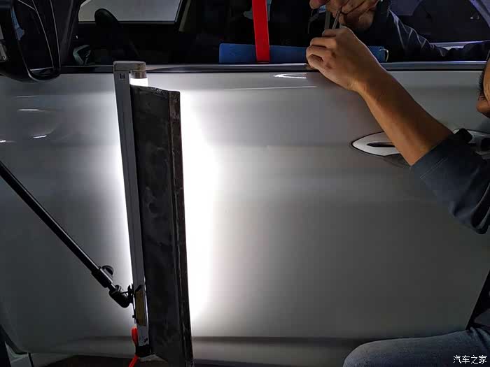 不需要拆卸门板,工具直接就能塞进去。在汽车最漂亮的腰线上,这个坑很明显。肯定是旁边的车副驾驶用力开车门造成的。