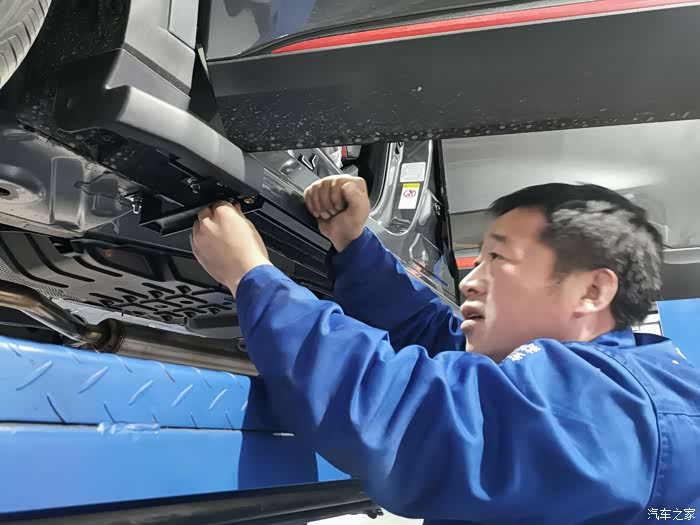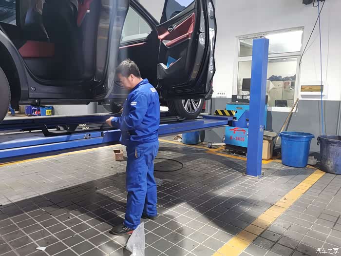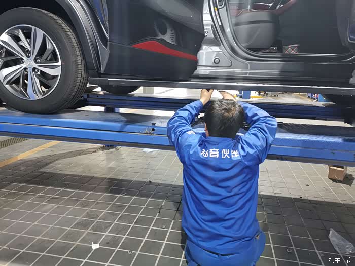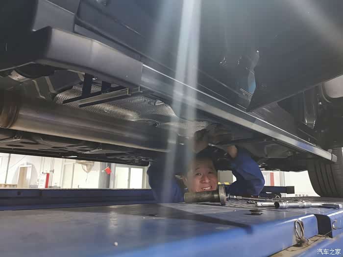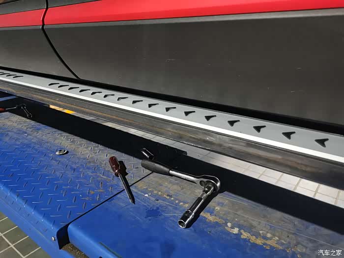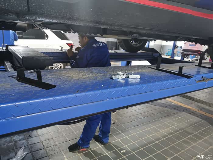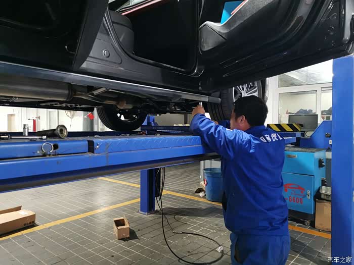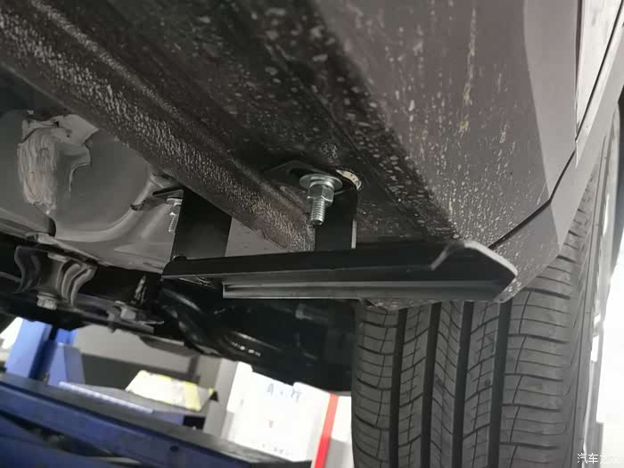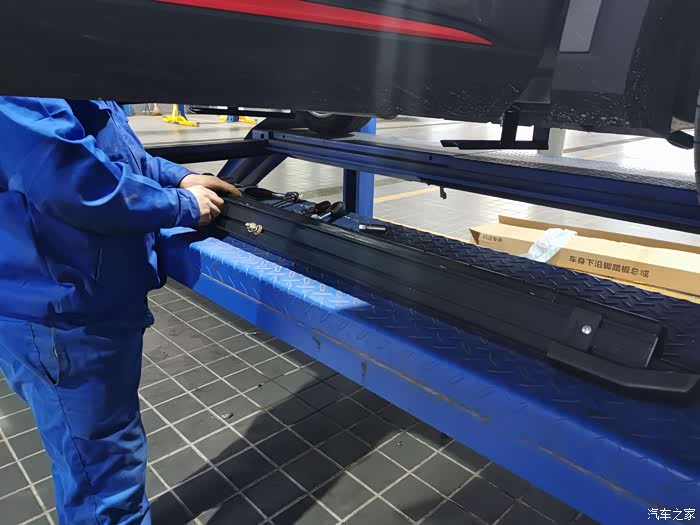 来到4S店,谈好了工时费,最后说好了装一幅脚踏板,优惠下来80元。开单子后,工作人员将车开上了架子。