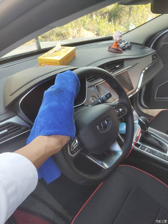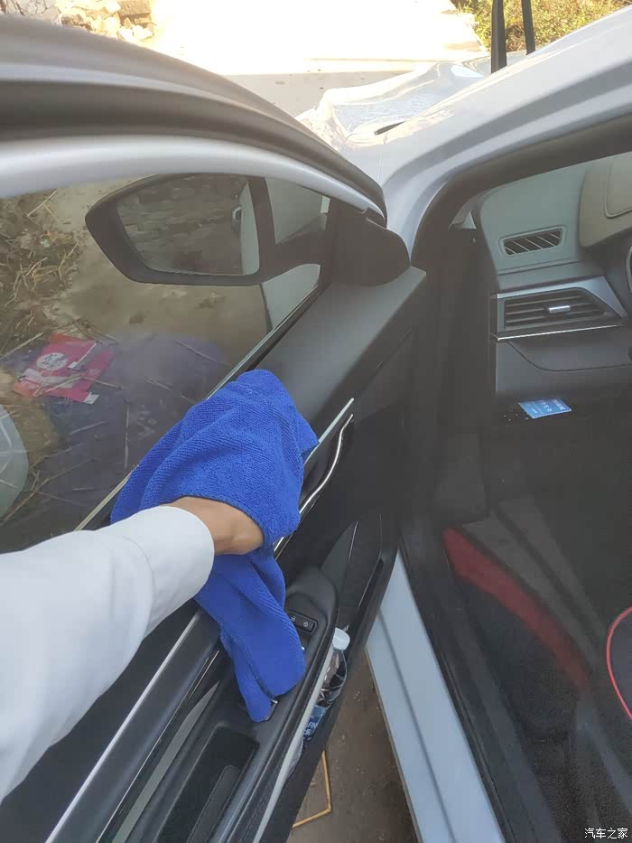 吸完灰尘就是擦车。这里我也是用洗衣液兑点水再擦,这样子手上出的汗啊什么的,都会擦调。还会留一点点清香味在车子里面。