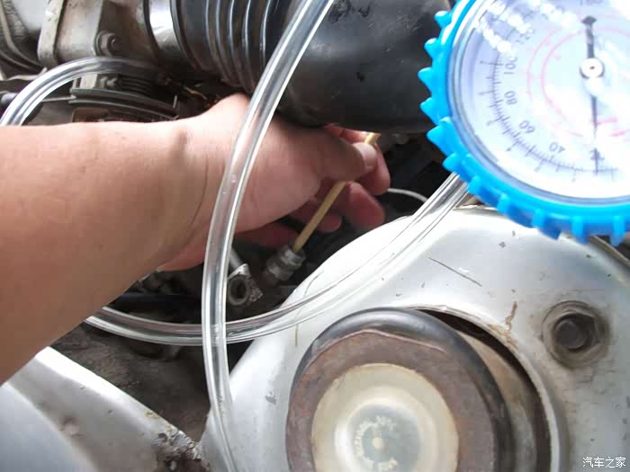空放气完成后,我进入车内,按记录本所记要点(风量最大,关车门,开AC)测试,一会温度降下来很凉爽,很激动终于有效果啦!到汽车外一看地上有水滴答滴答,基本符合标准,可惜呀,没有温度计,只有凭感觉了 在第一次抽真空这段时间,我把补充管路和制冷剂连接好,备用。