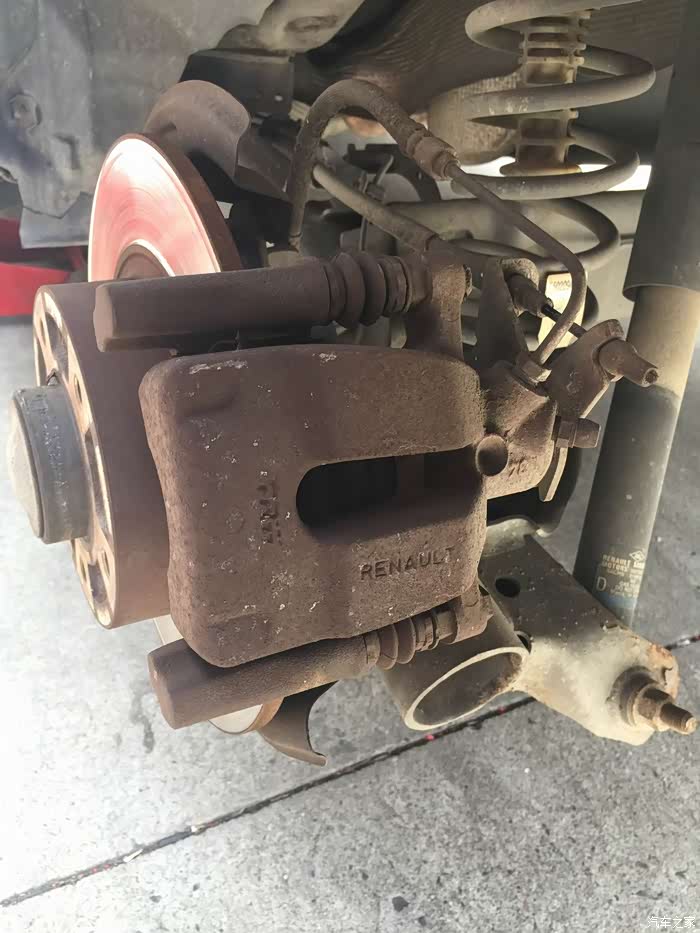 左后轮的固定刹车片的部件,上下两根固定螺丝,部件上还印有雷诺LOGO字母,但这个部件侧面印有TRW字母,所以可以看出该部件是由美国天合公司代工的